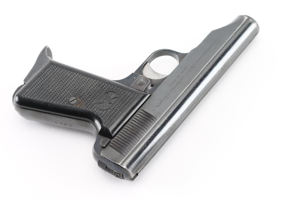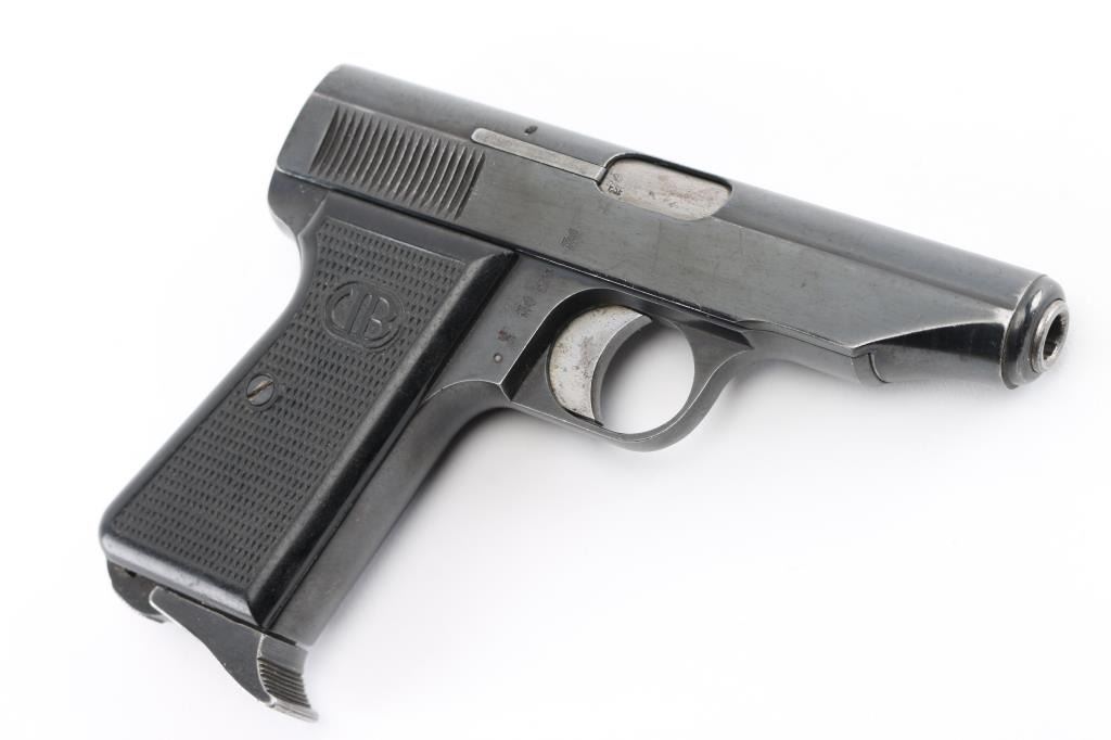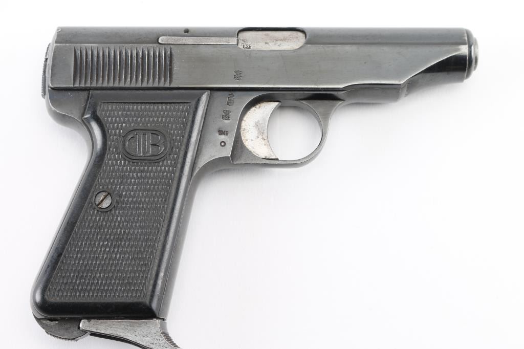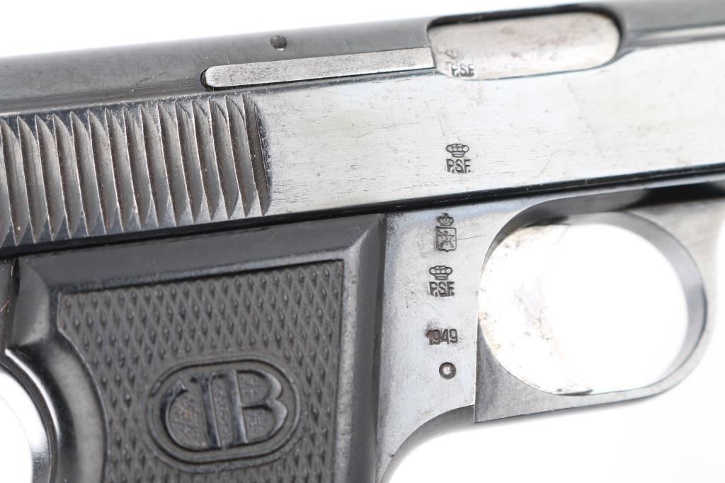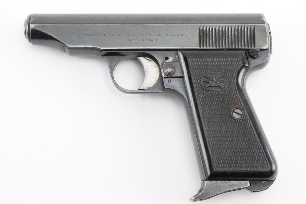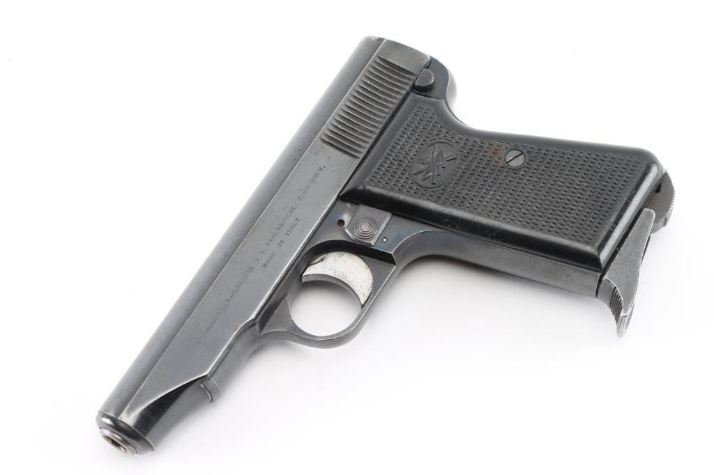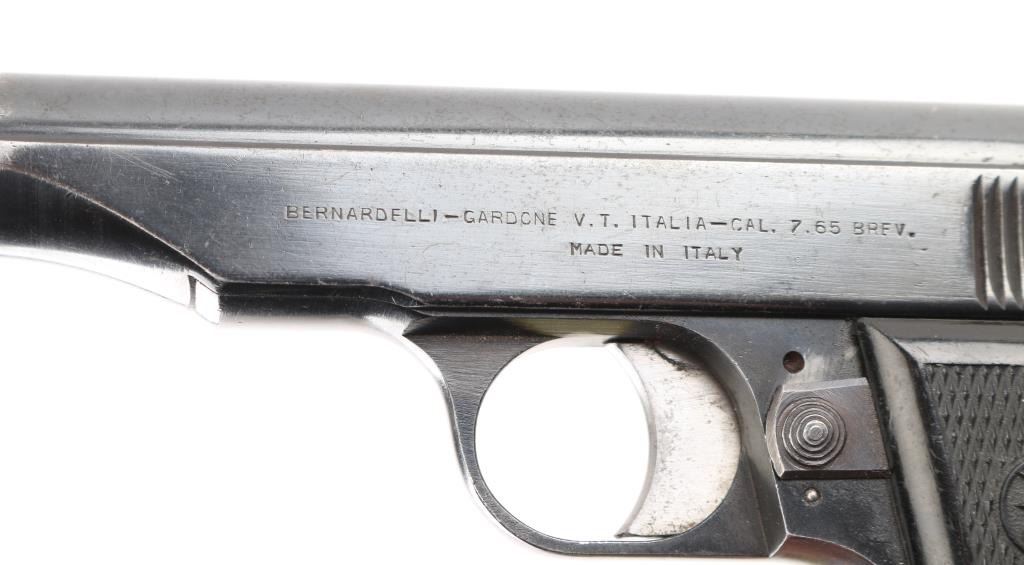 Striker fired single action semi-automatic compact pistol, manufactured in Italy circa 1949 (date on frame). Features blued finish, 3.6" barrel, diminutive fixed sights, smooth trigger, manual safety on the left side of the frame, 8 round magazine with finger rest floorplate, steel frame and two-piece checkered black synthetic grips with factory insignias. Bore is good condition, a few areas show darkness. Retains 90% finish with edge losses, handling marks, fading on grip straps. Grips are very good. One magazine. Condition is NRA Very Good *** C&R Firearm ***
