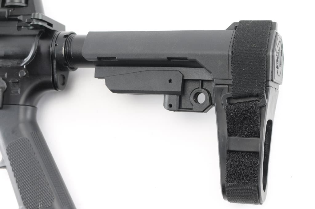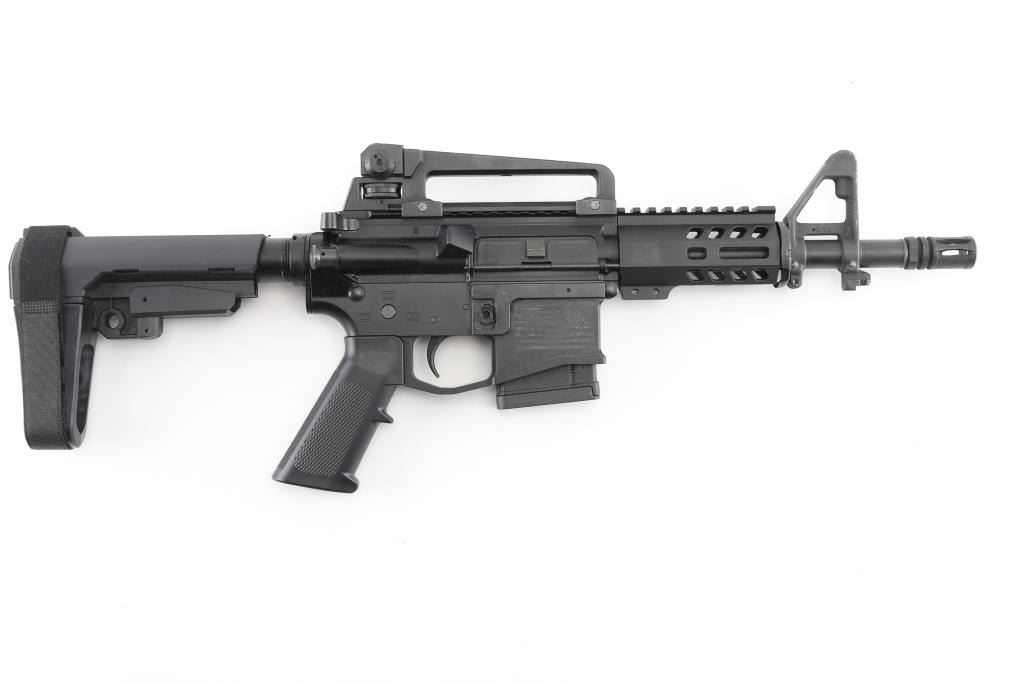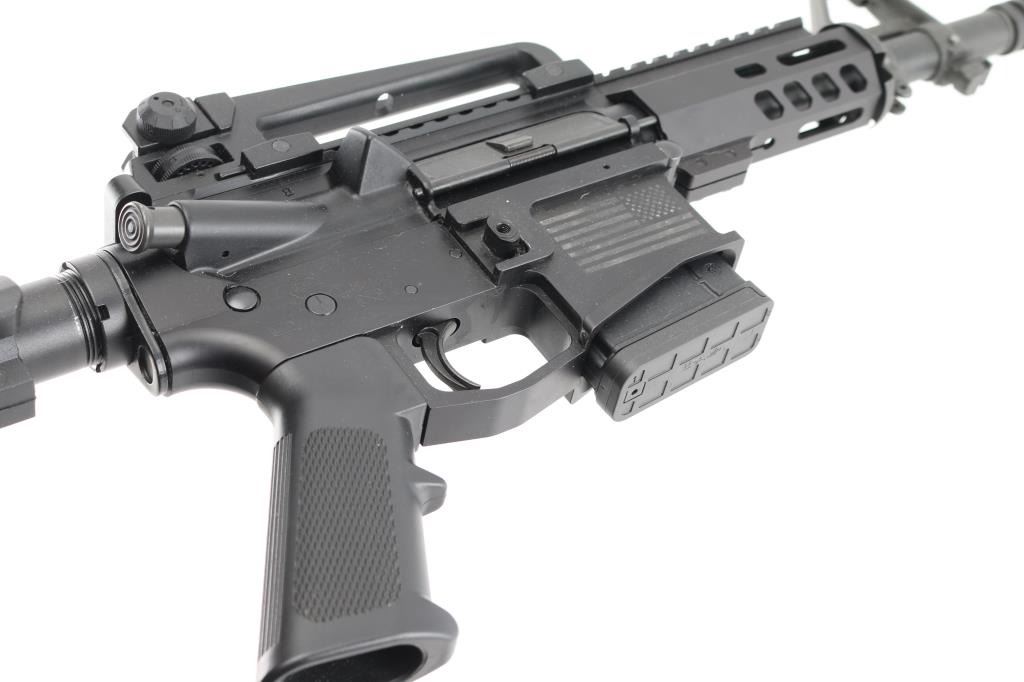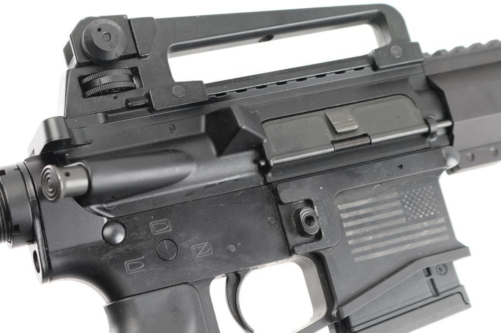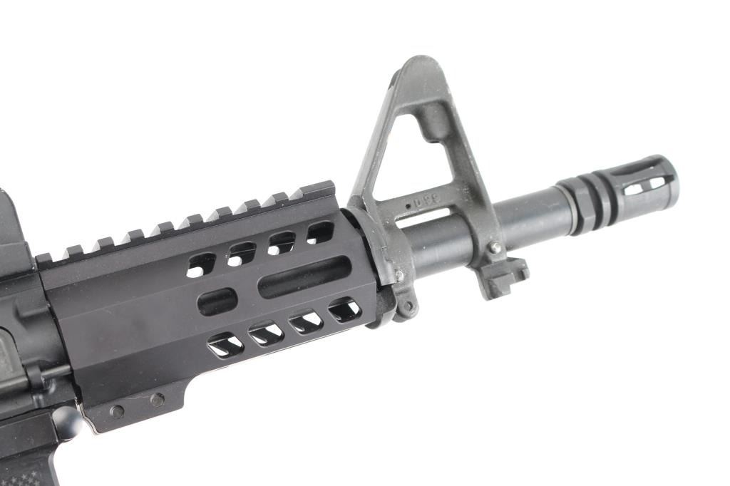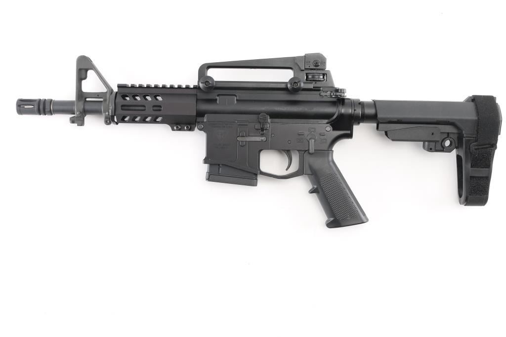 SN: 20520. Gas operated semi-automatic AR platform pistol chambered in 5.56 NATO. Features a matte black finish, 8 1/2' barrel, A2 birdcage flash hider, A2 shrouded adjustable post front sight with bayonet lug, flat-top upper receiver with forward assist, shell defector & dust cover, removable carrying handle with adjustable flip peep sights, push button magazine release, 10-rd Lancer magazine, manual safety, A2 black synthetic pistol grip, steel handguard , buffer tube. American flag on magazine well. Rifle exhibits approximately 95% of it's black finish with some handling wear/minor scratches. Action is smooth, the bore is very good/bright. Condition is NRA Near Excellent. Modern Firearm.