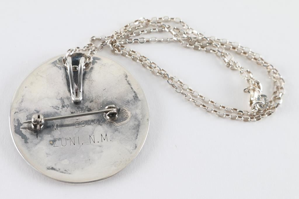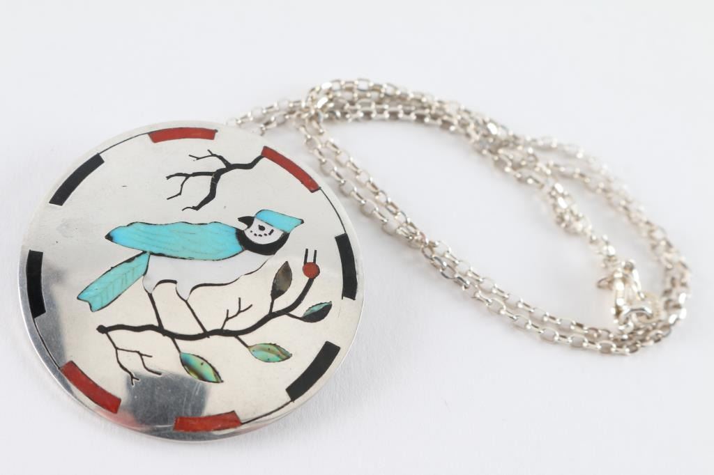 with bluebird signed " Zuni NM" and "Medaake" on sterling chain.