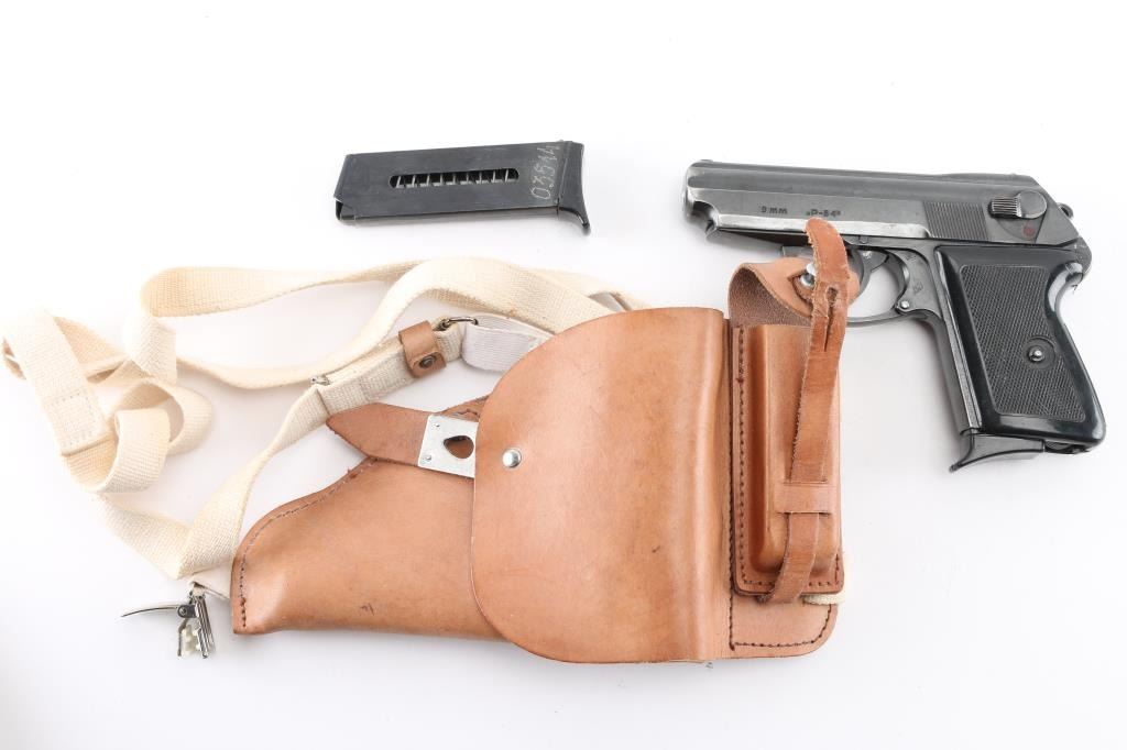 Cold War era semi-Automatic. 6+1 Capacity. Polish made "Makarov". Manufactured 1971. Blowback action. 3.3" barrel. Front blade and notch rear sights. Slide mounted thumb safety, Imported by CAI. (Left slide) Blued metal slide. Parkerized frame. One-piece checkered black plastic grips. Bore appears excellent/bright. Blue finish is about 80% with some edge wear/scratches, handling loss. Slide action is smooth/tight. Grips are very good. Comes with brown leather Military/Police shoulder holster , two 6-rd magazines. NRA Condition-Very Good. C&R Firearm.