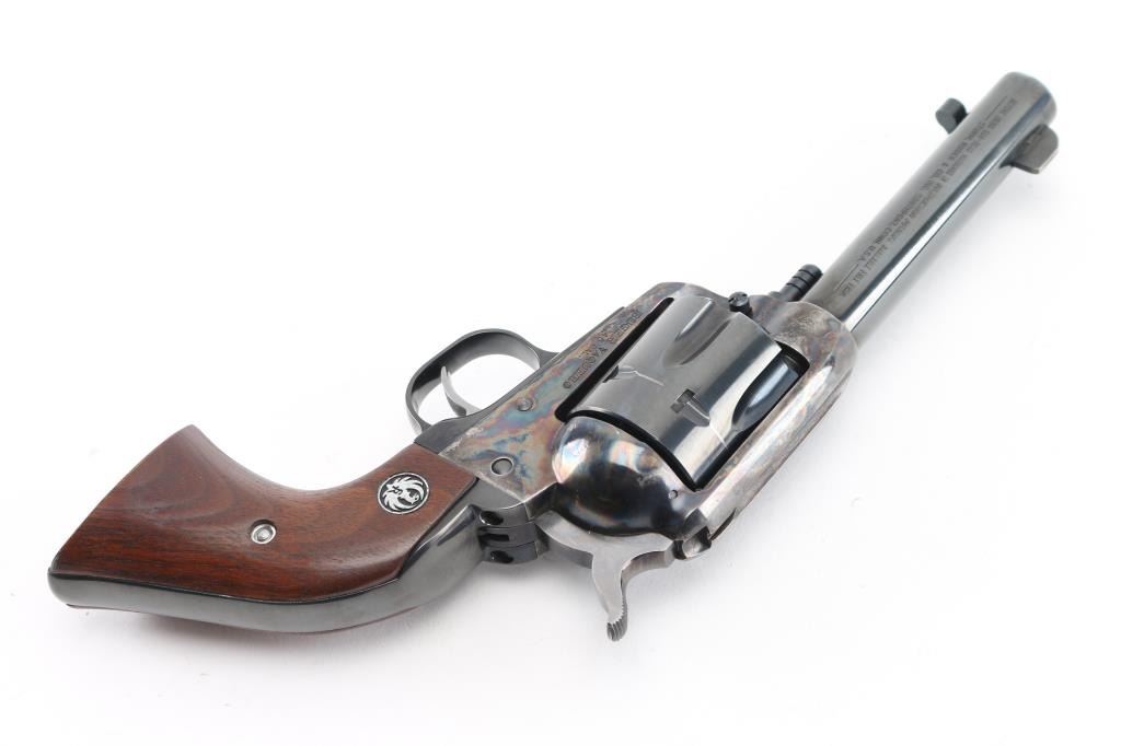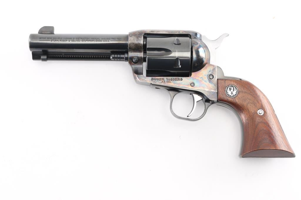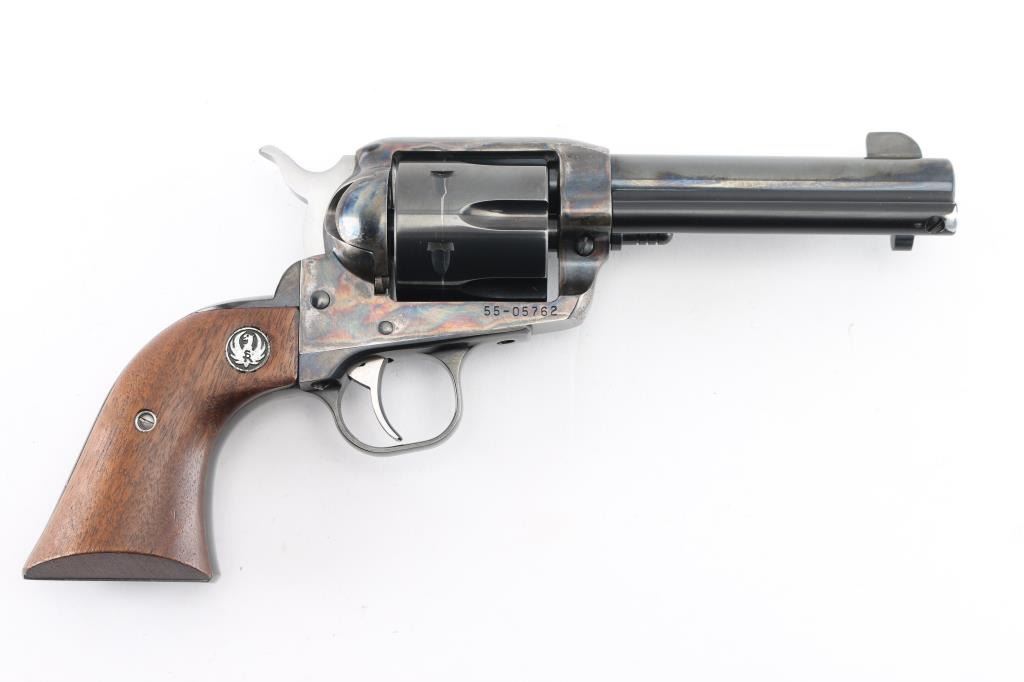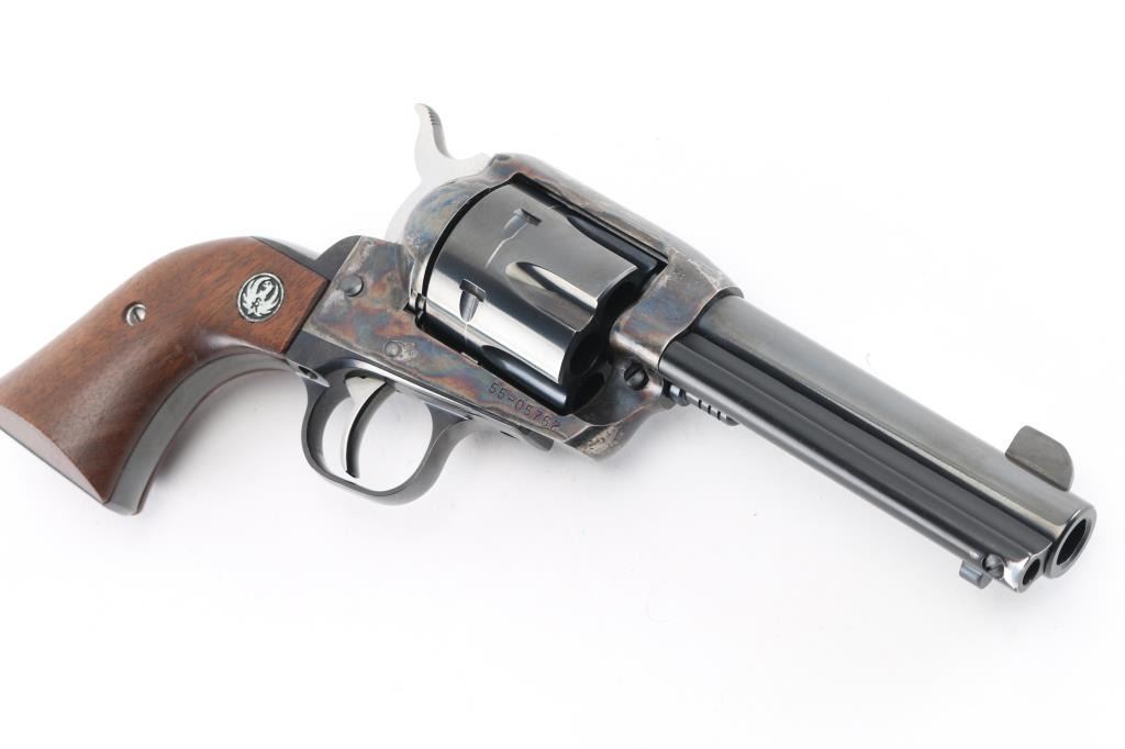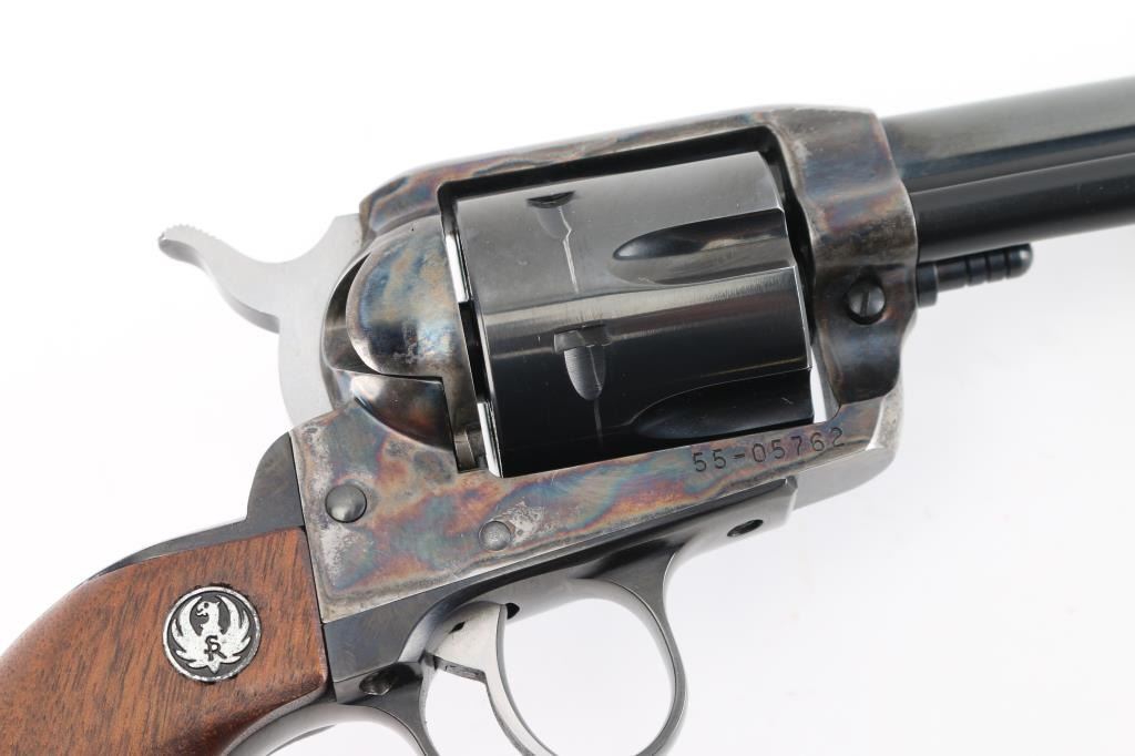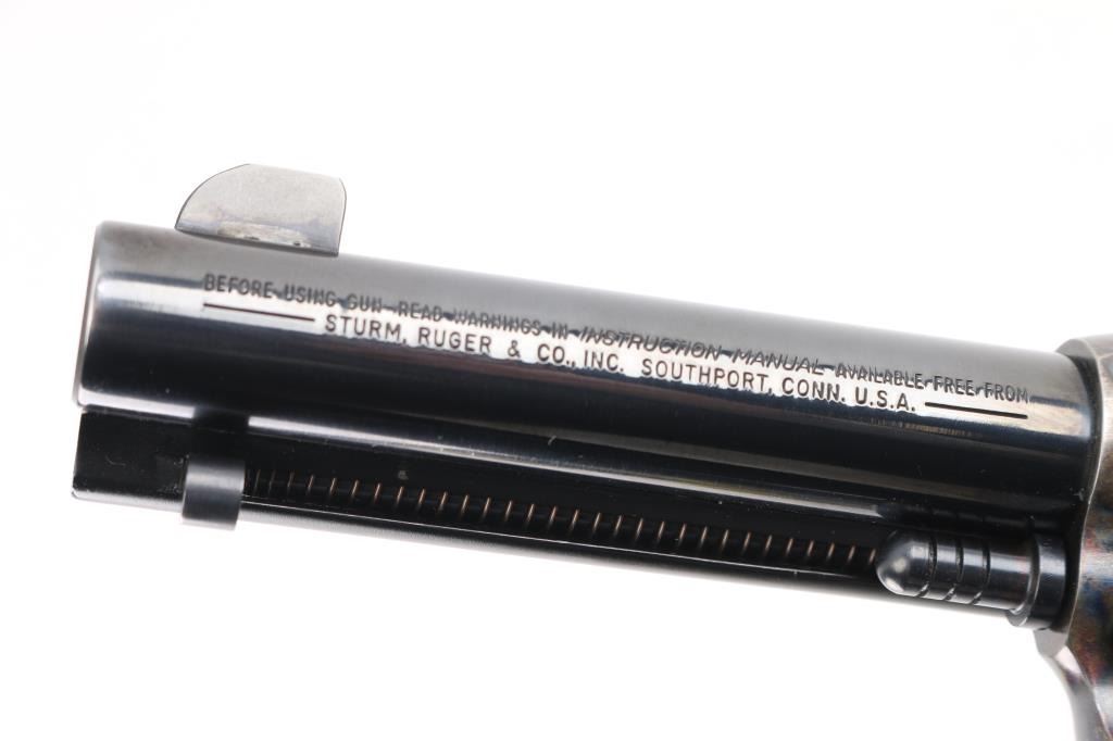 American made single action, 6 shot, revolver chambered for .45 Colt ammunition circa 1993. It features a 4.1/4" blued barrel and fluted cylinder. Case hardened frame. It has a blade front sight, integral rear sight, smooth blue trigger and hammer with polished sides. It has two piece smooth wood grips with Ruger medallions. The Metal finish looks good with a barely visible drag line on the cylinder, there is a rub on the top of the extractor housing showing bare metal. Grips are excellent. Bore looks great, bright. Comes with original Ruger factory box wit Matching serial number. NRA Condition-Very Good+. Modern Firearm.