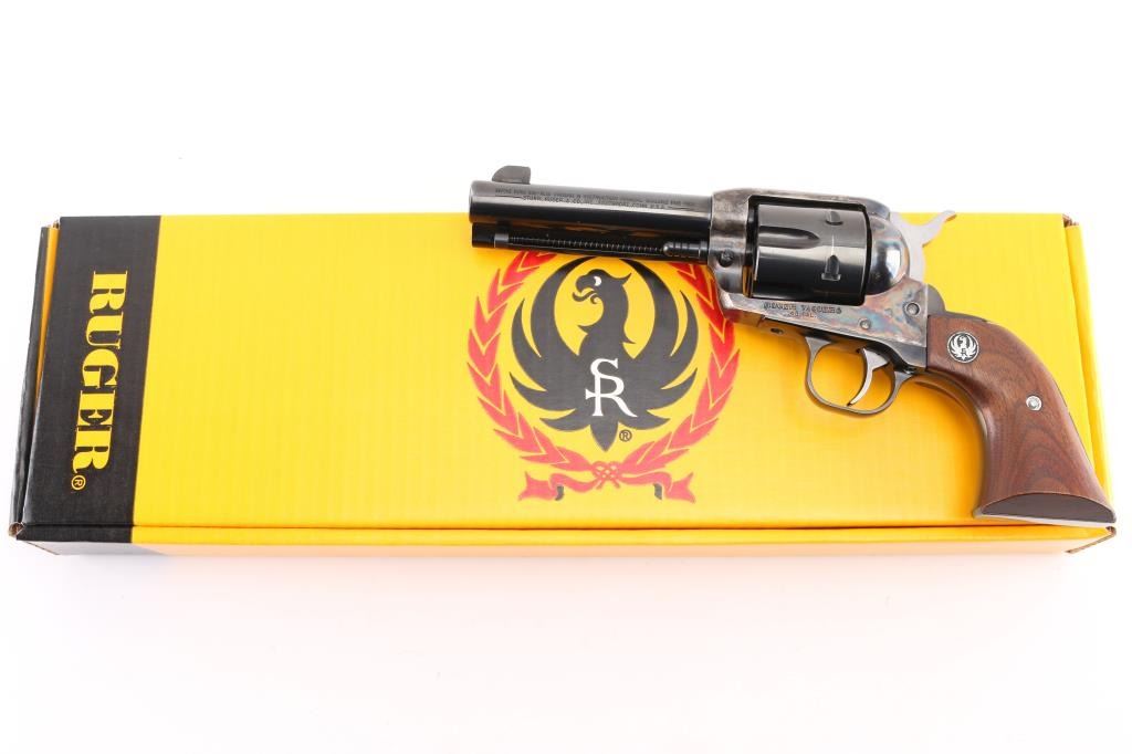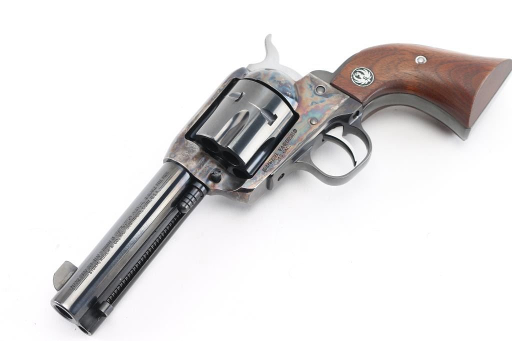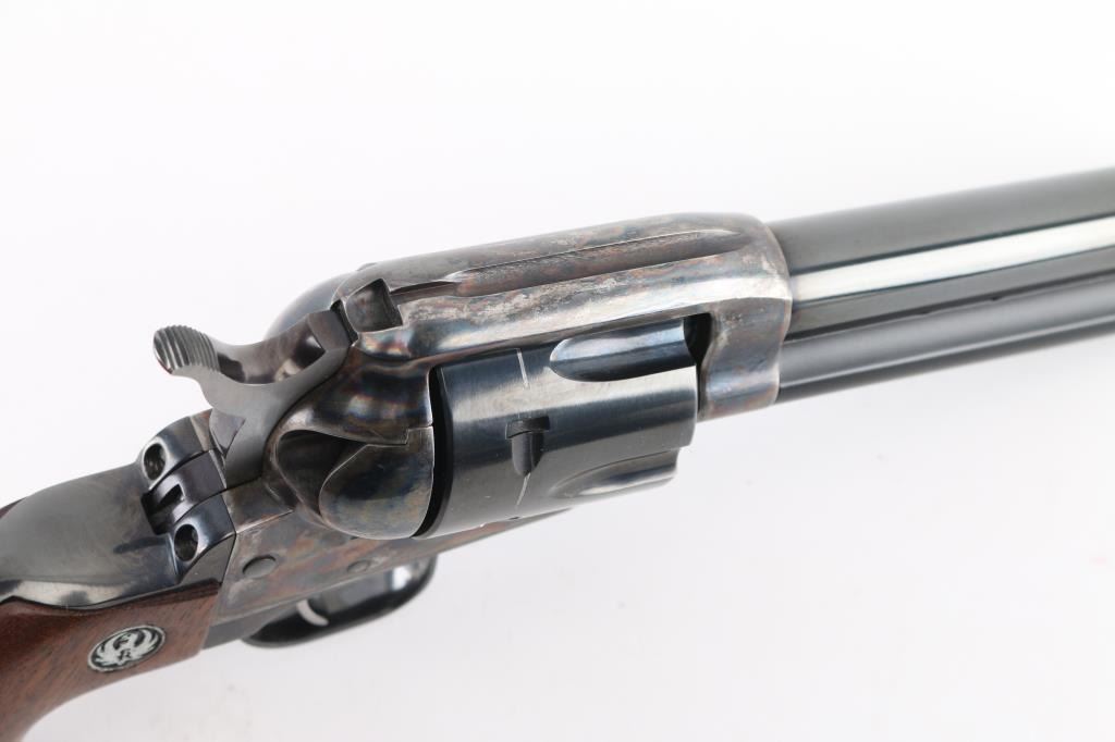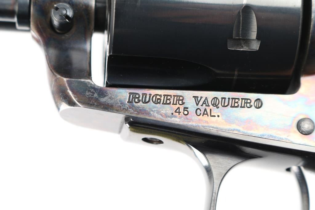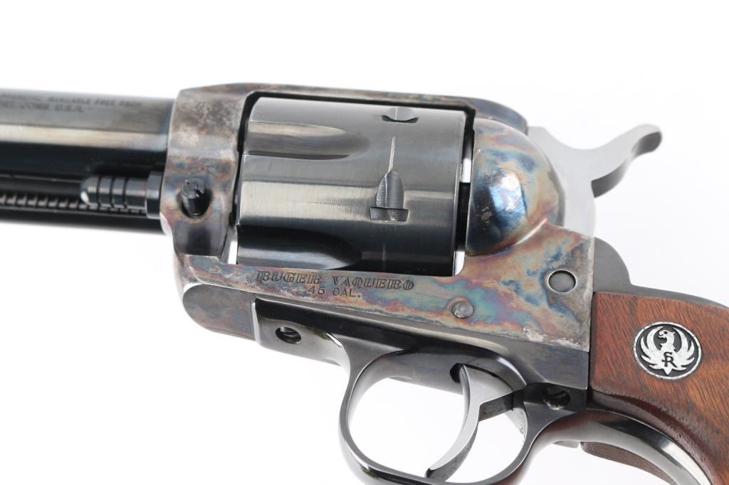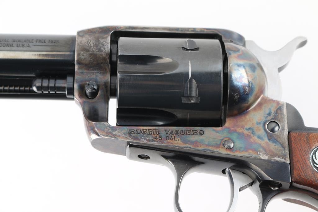 American made single action, 6 shot, revolver chambered for .45 Colt ammunition circa 1993. It features a 4.1/4" blued barrel and fluted cylinder. Case hardened frame. It has a blade front sight, integral rear sight, smooth blue trigger and hammer with polished sides. It has two piece smooth wood grips with Ruger medallions. The Metal finish looks good with a barely visible drag line on the cylinder, there is a rub on the top of the extractor housing showing bare metal. Grips are excellent. Bore looks great, bright. Comes with original Ruger factory box wit Matching serial number. NRA Condition-Very Good+. Modern Firearm.