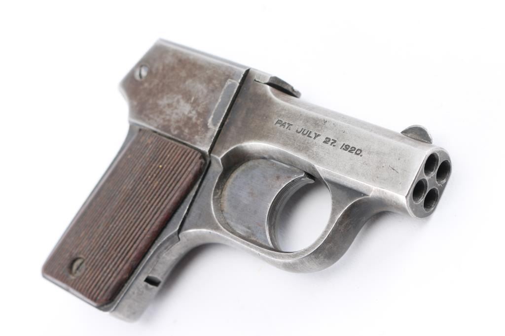 ***For Parts or Repair*** Four shot compact pistol with fixed multiple barrels, rotating internal striker, fires double action only. Features 2.5" barrels, wood grips. Bores are poor to fair condition, pitted, with visible rifling. Retains 20% blued finish, most metal now shows a brown color, light patina in several places. Wood grips are ribbed, good condition. Barrel latch is loose, no spring tension. Grip panels loose. Internal parts broke or missing - non firing condition. Condition is NRA Poor - needs repair *** C&R Firearm ***