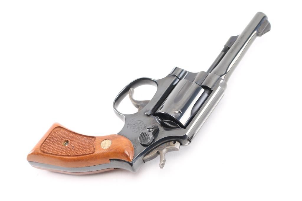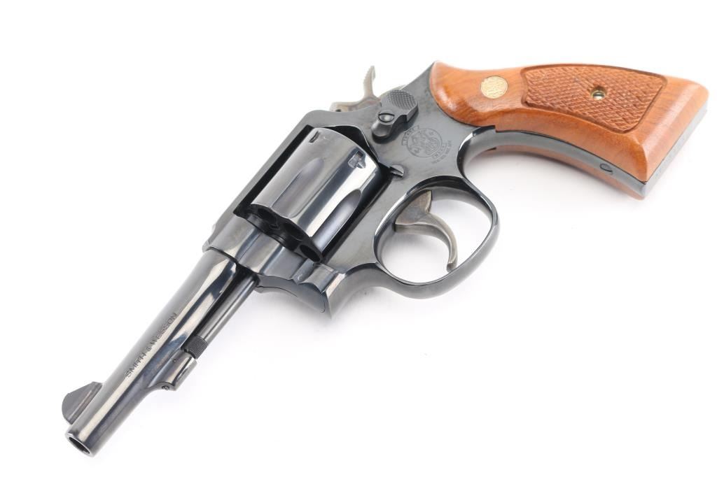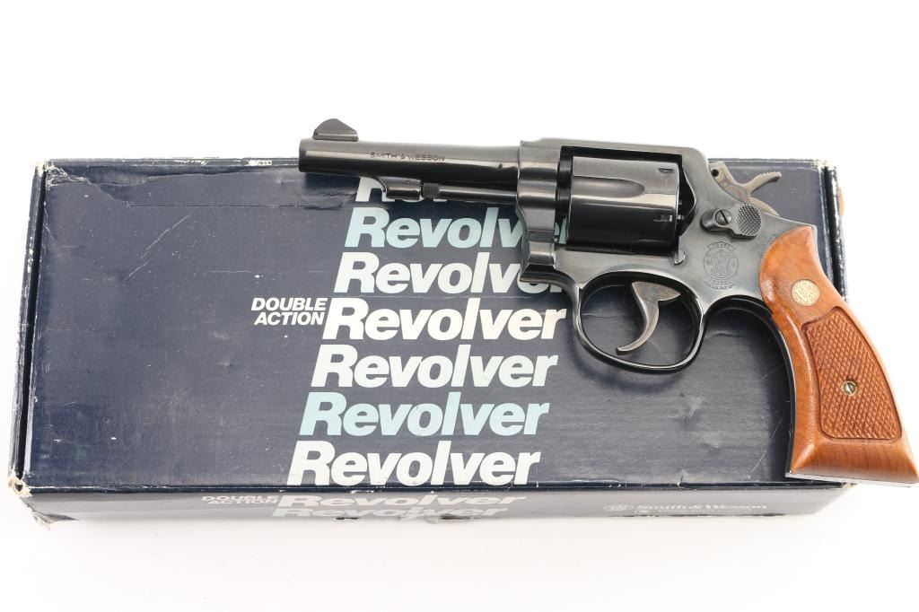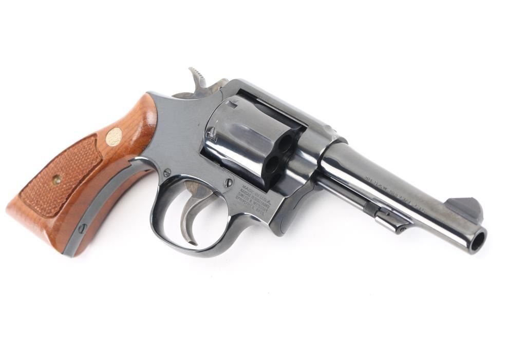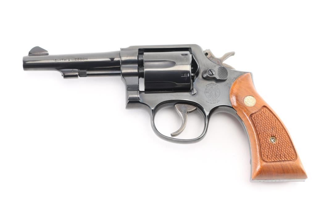 SN: AEP3185. Double/Single-Action revolver. 6-rd capacity. K-frame. Model 10-7, 1977-changed gas ring from yoke to cylinder for standard model. 4" barrel with serrated front blade, and square notch rear sights. Square butt. Blued finish. Checkered walnut Magna grips with S&W medallions. Smooth trigger. Action is crisp/tight. Cylinders/bore are excellent. Blued finish is 98%, with some tracking on the cylinder. Grips are excellent. Comes in the original blue S&W box with matching label, paperwork, & cleaning rod. . NRA Condition-Excellent. Modern Firearm.
