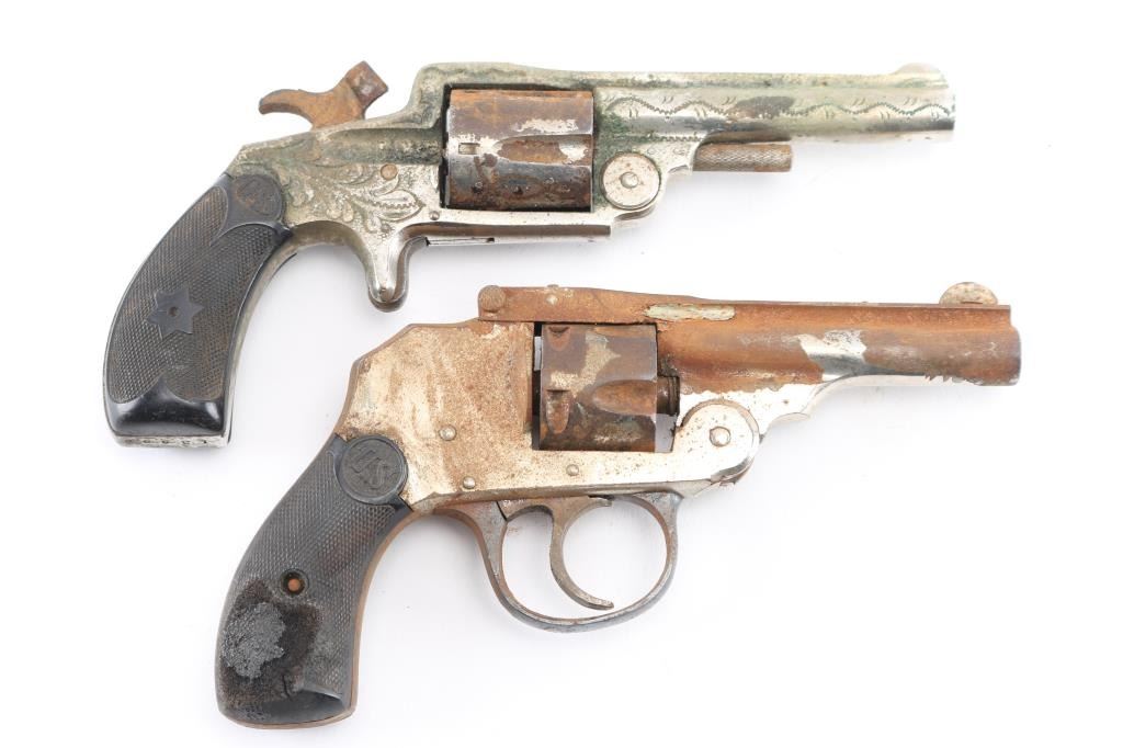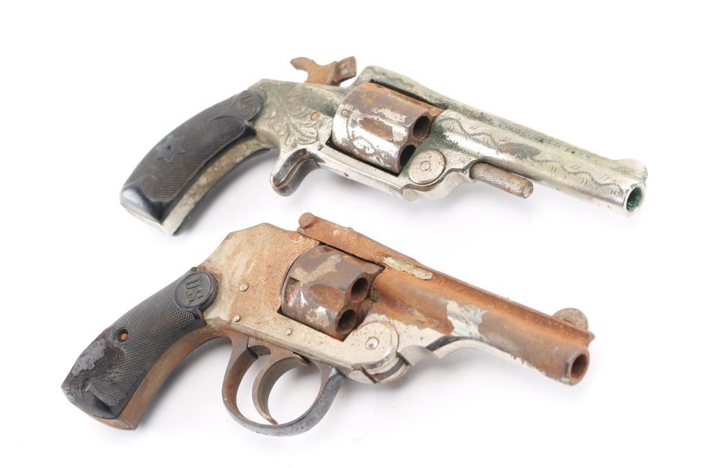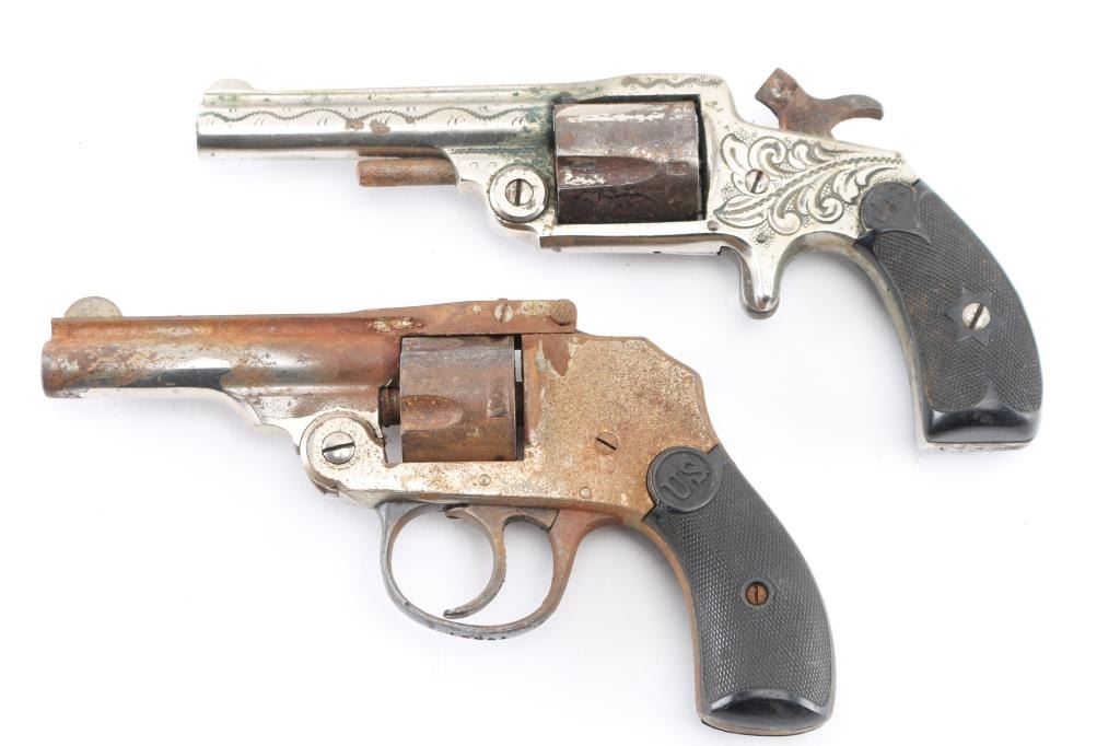 1) Otis A Smith New Model 32 cal Rimfire SN: 12339 Single action spur trigger 5 shot solid frame revolver circa 1880's with 3" round solid rib barrel. Nickel finish with enhanced engraving, checkered hard rubber round butt grips with "OAS" monogram molded in and fixed sights. Grips are good. Mold and rust throughout. Bore is dark and pitted. Plated with rust. Condition is NRA Poor. *** Antique Firearm *** 2) Iver Johnson US Revolver DA 32 cal SN: B15051 Vintage break top hammerless double action revolver, chambered for older vintage .32 caliber ammunition. Features nickel finish, blued trigger guard, case hardened trigger, checkered black hard rubber or plastic grips with "US" logo, 3" barrel, 5 shot fluted cylinder, fixed sights. Bore is rusted, eroded and dirty. Finish is flaking with rust, left grip is good with right grip melted on bottom half. Non-working action. Condition is NRA Poor (mechanical issues) *** C&R Firearm ***