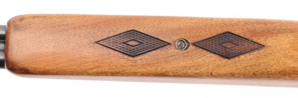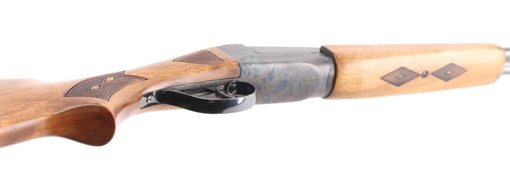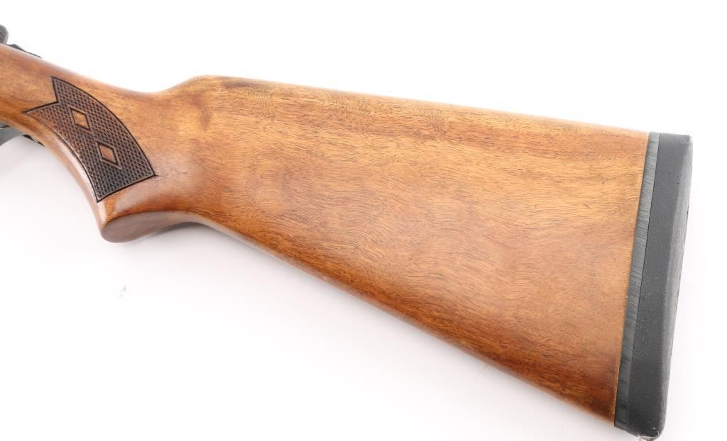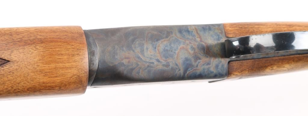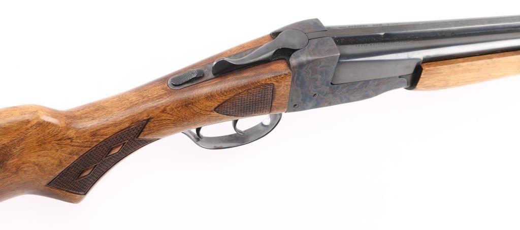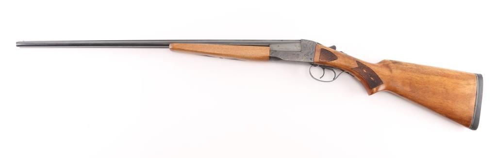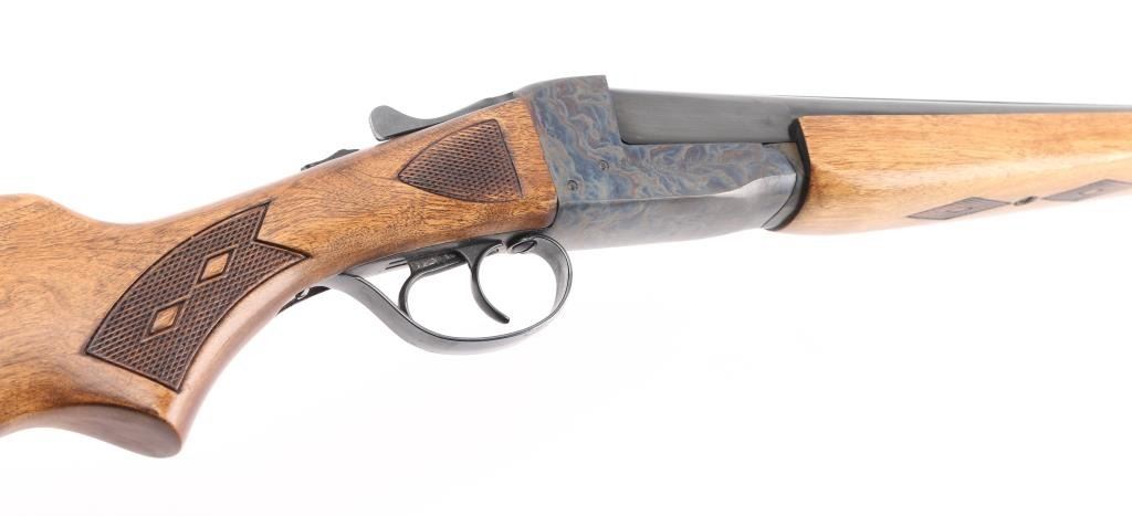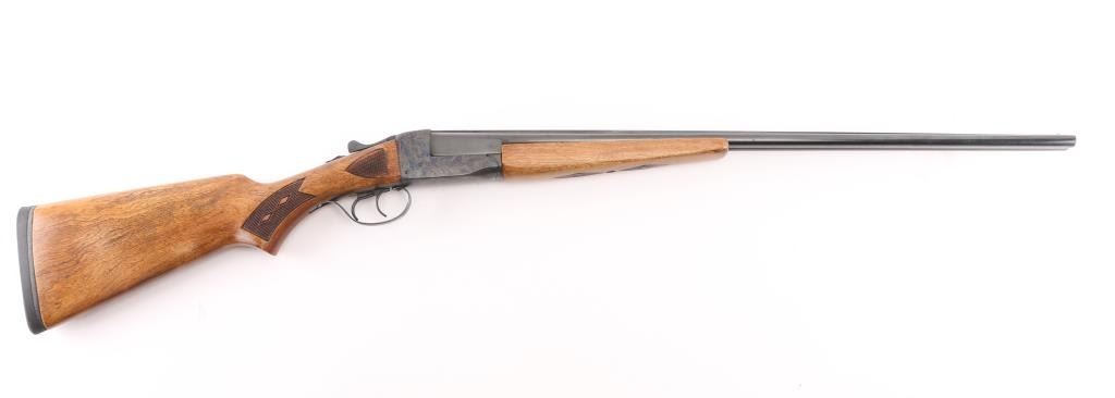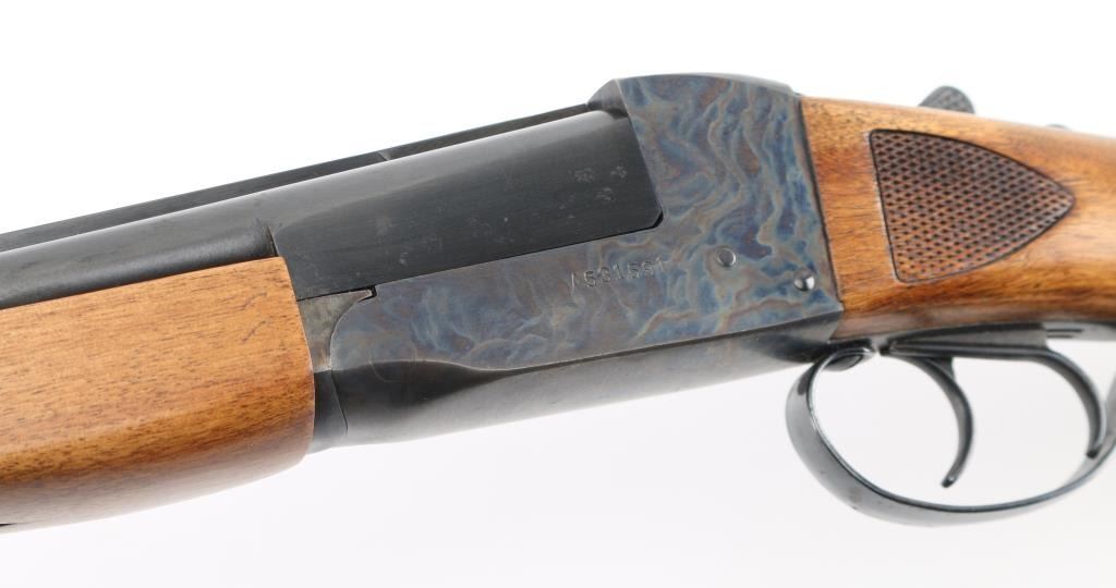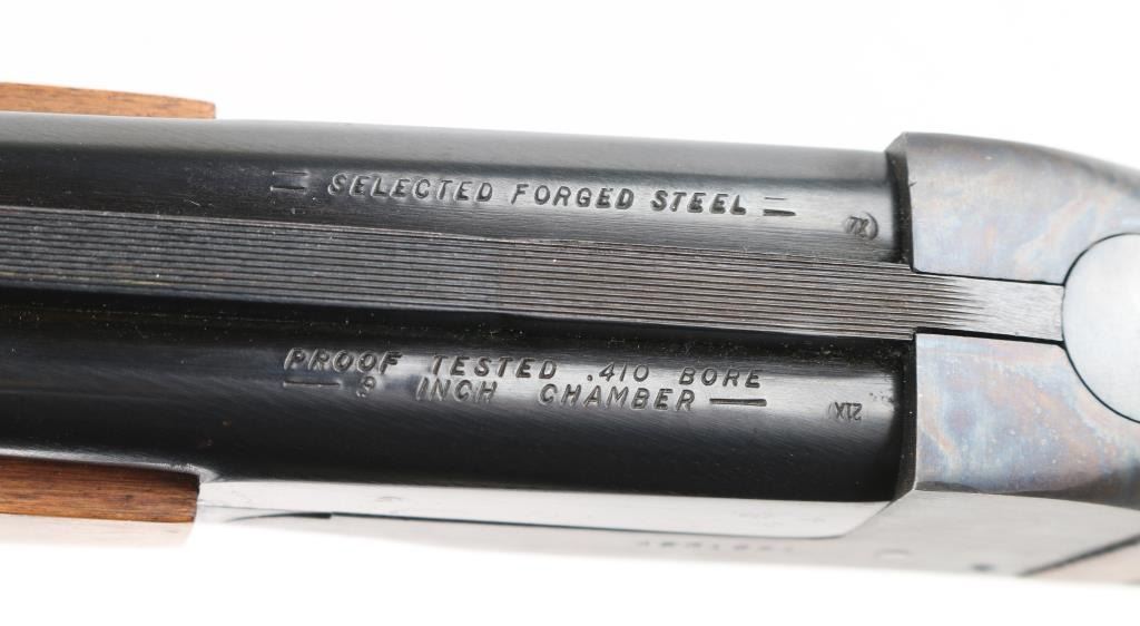 Manufactured 1970. Double barrel side by side shotgun chambered for .410 gauge shells, 3" chamber. Features blued finish, case color receiver, wood 2 piece stock with pistol grip shape, 26" barrels, steel bead front sight, tang safety (automatically moves to safe on opening), top lever, double triggers, extractor, 14-1/4" length of pull to forward trigger, rubber recoil pad. Bores are excellent/bright. Metal finish is 98% with some minor scratches. Wood is very good condition. Tight lock-up. Condition is NRA Excellent. C&R Firearm.