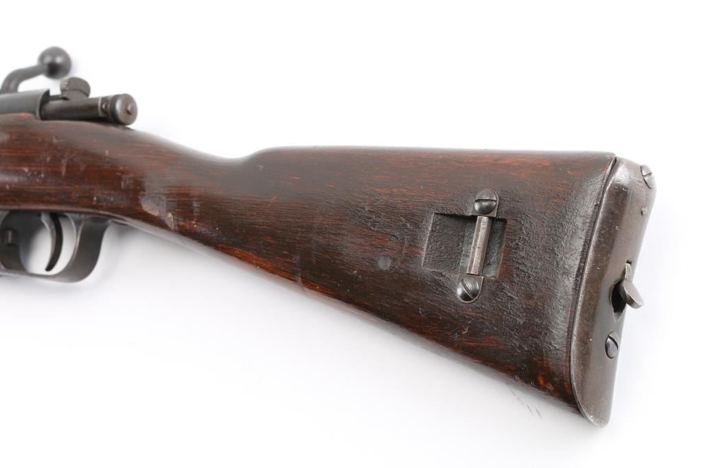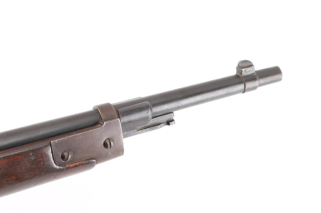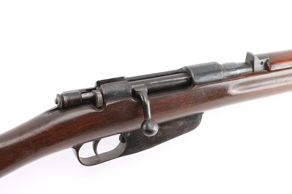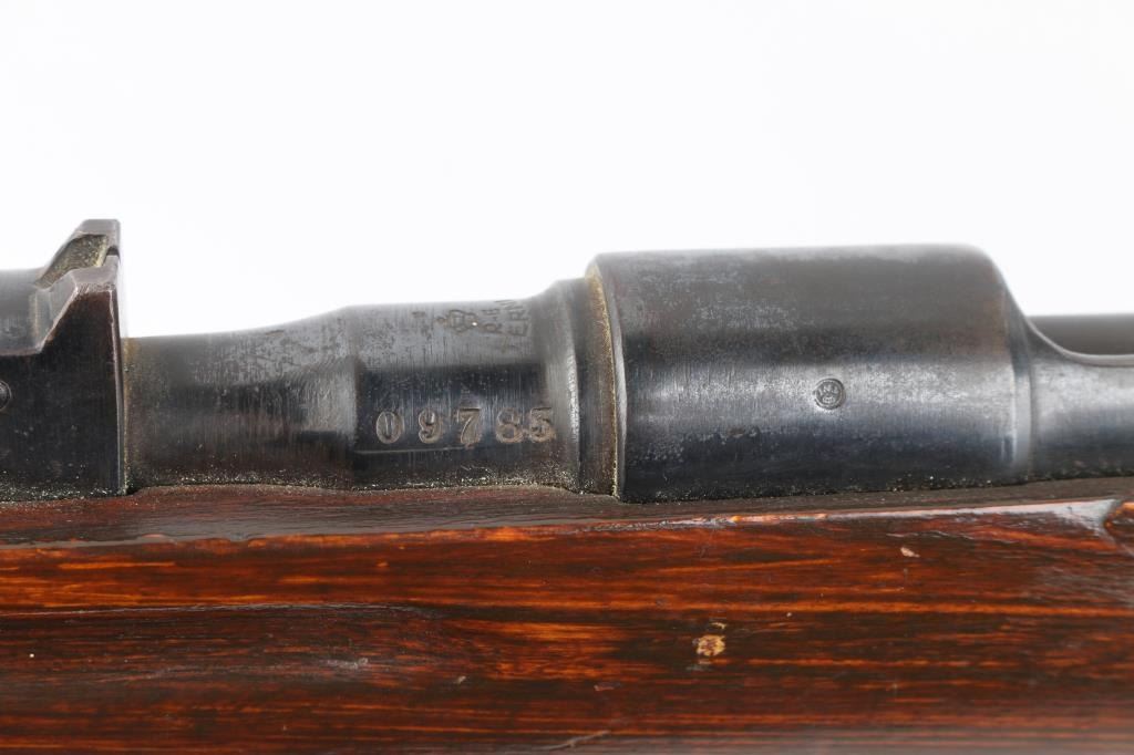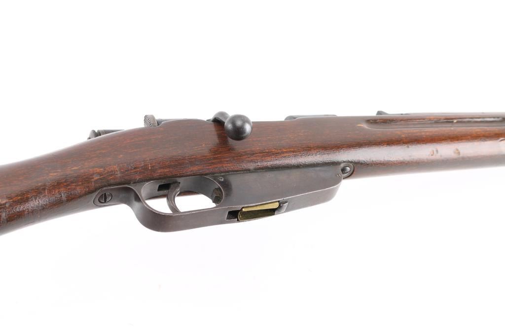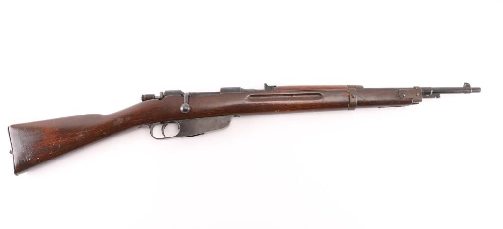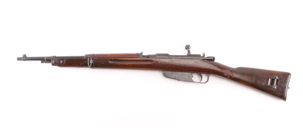 Italian military blued bolt-action rifle chambered in 6.5mm circa 1941, 21" barrel with blade front sight U-notched rear sight, bayonet lug, smooth trigger and curved bolt lug, sling swivels and smooth metal butt plate. Import marked. Retains 60% of metal finish with some edge wear, surface rust and patina. Stock has been revarnished and has dents and scratches throughout. Bore is very good with a little dirt and action works well. Comes with 33 rounds of PPU factory ammo, 100 rounds of reloaded ammo, 7 shell casings, Lee reloading dies and a pack of 5 sear springs. Condition is NRA Very Good. C&R Firearm.