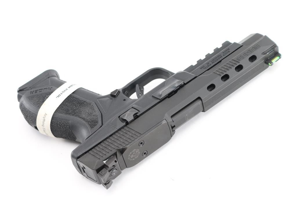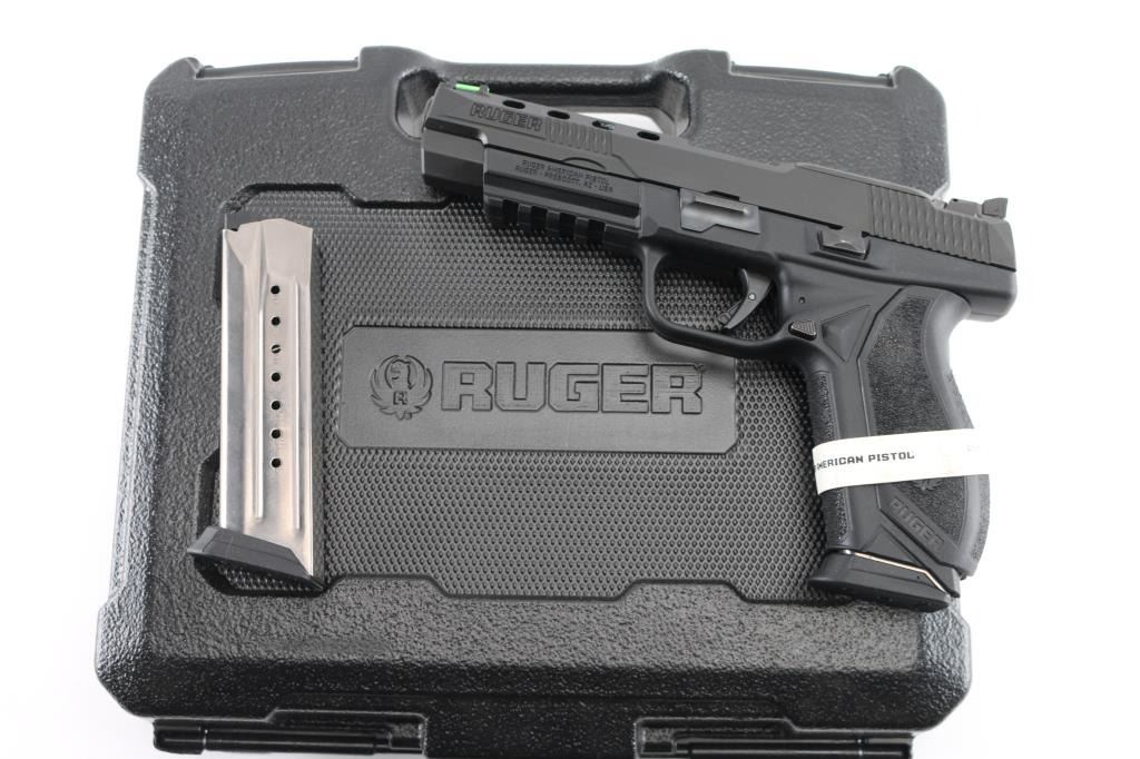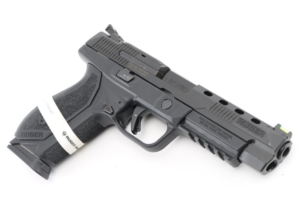 Semiautomatic pistol features black nitride finish, ported slide, black polymer frame with accessory rail, 4.2" barrel, 3 dot Green fiber optic, adjustable notch dovetailed sights, interchangeable backstrap inserts, ambidextrous slide stop lever & frame mounted manual safety, manual safety tab built into trigger, single action striker fired. Condition is new. Includes (2) 17 round magazines, (2) different backstrap inserts, manual, factory hard black plastic case. NRA Condition-Perfect in Box. Modern Firearm.