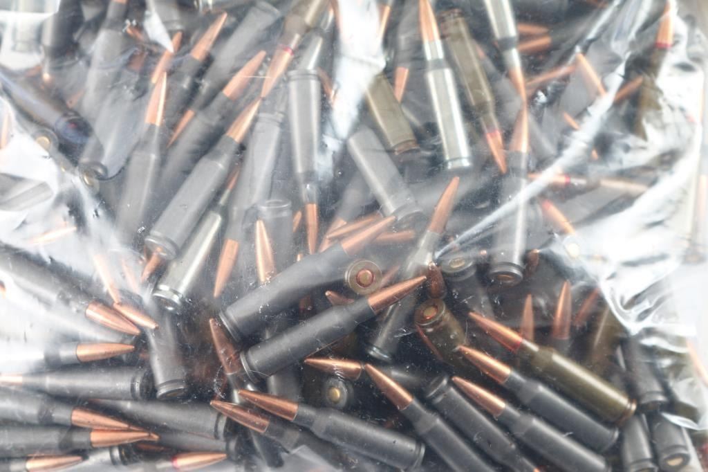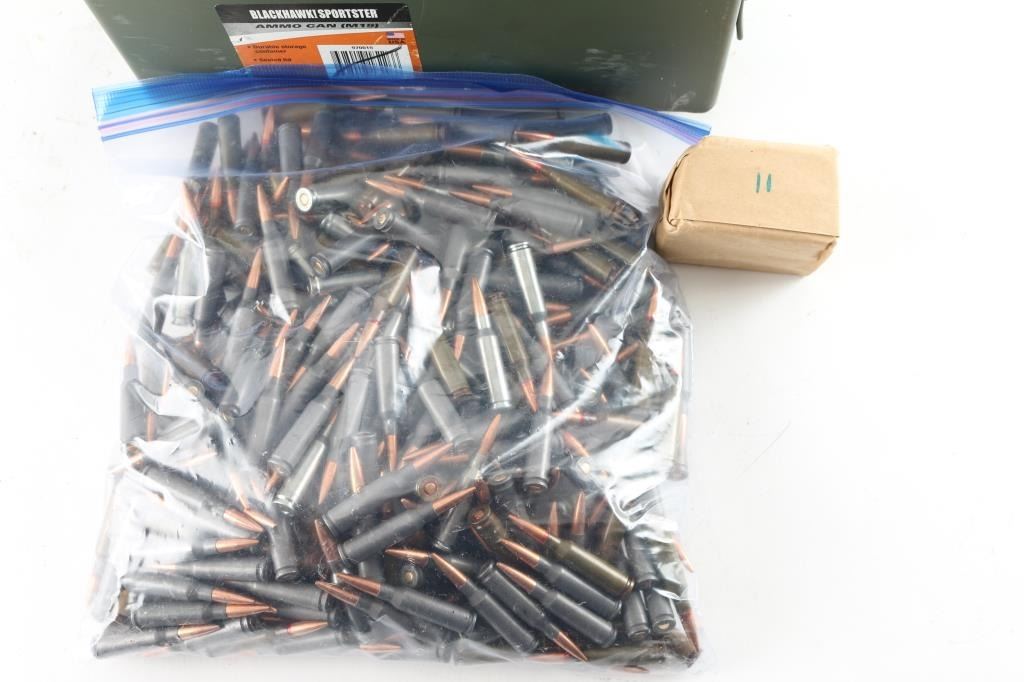 contains mixed types, including Wolf or other brand commercial ammo with zinc or lacquer coated steel cases, some Russian 7N6. Weighs over 12 pounds including can.