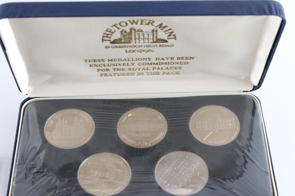 Here we have, from the Tower Mint, the Royal Mint and others, including 1) a five coin set featuring the Royal Palaces, in a hard case, 2) framed Queen Elizabeth II Coronation & Balmoral Castle coins, 3) a Mary Queen of Scots medallion, 4) 1993 Buckingham Palace Commemorative coin. 5) Fourteen coins commemorating different buildings and people. All of these are in very good to excellent condition. Nice way to either start a collection, or finish one. This is a steal.