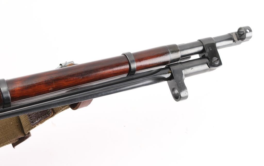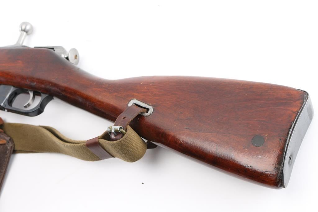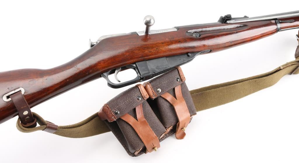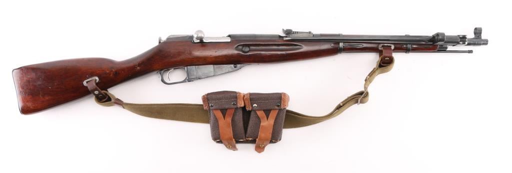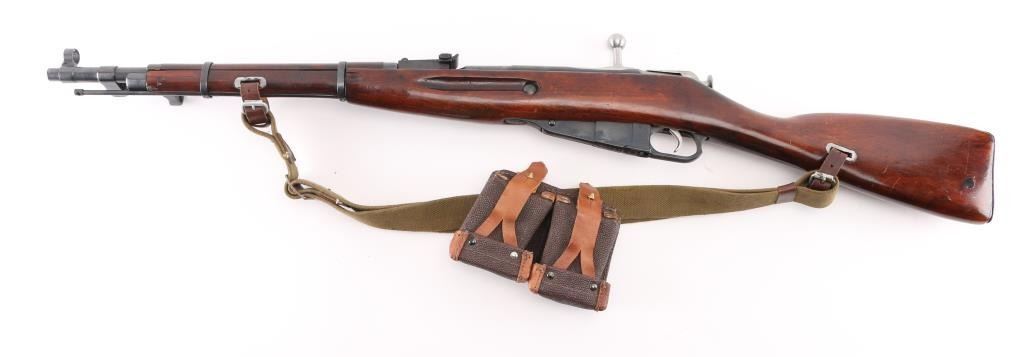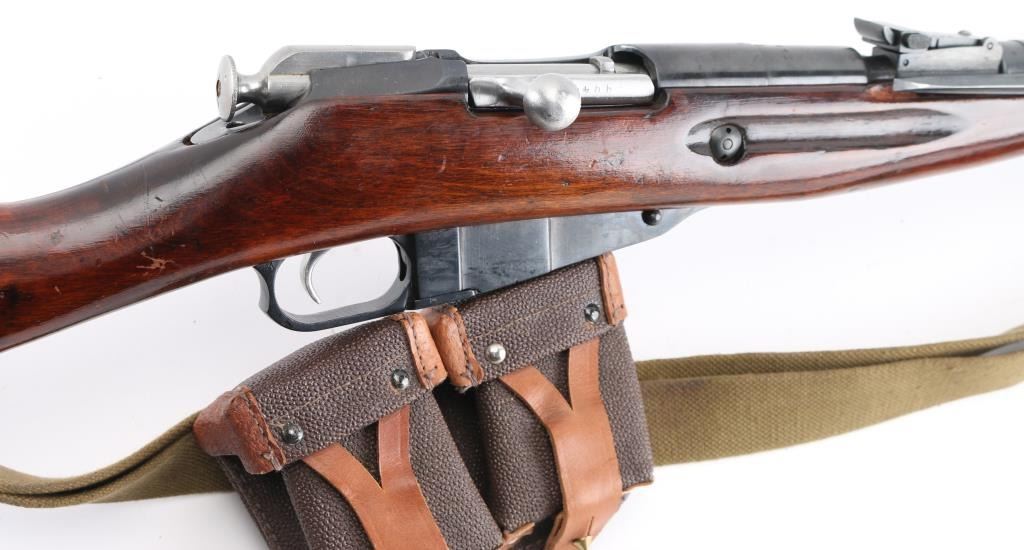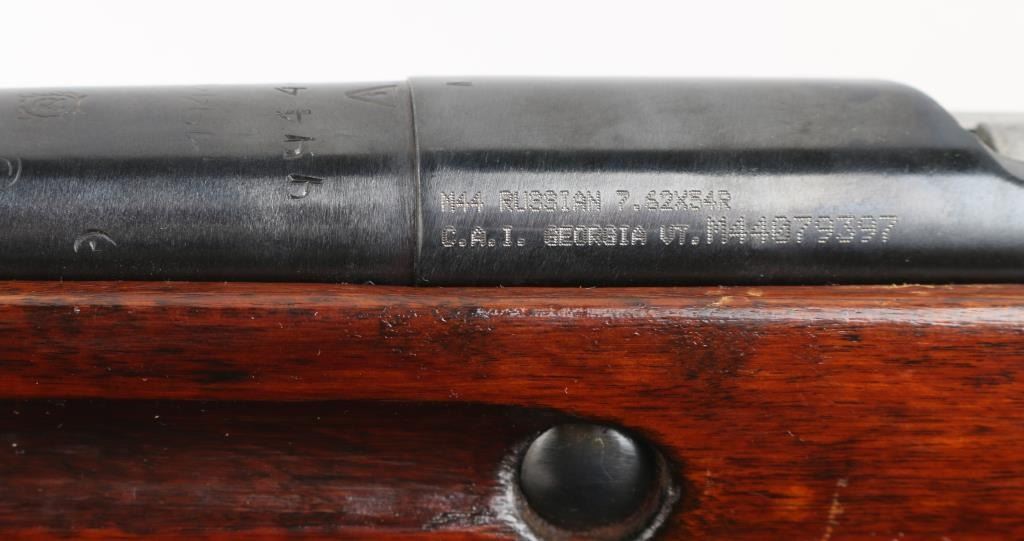 Russian (Soviet Union) military bolt action rifle imported by CAI, Georgia VT. Dated 1944. Features 20" barrel, hooded post front & tangent rear sight, folding spike bayonet, manual safety, cleaning rod, sling slots. Bore is good condition, mostly bright with some gray in the grooves. Retains 90% dark re-blued finish with handling marks. Bare metal bolt is clean polished condition. Varnished hardwood stock & handguard are very good condition with scrapes, dings. Original serial number matching where observed, importer applied number on left side of receiver. Includes proper web sling, ammo pouch. Condition is NRA Good++ *** C&R Firearm ***