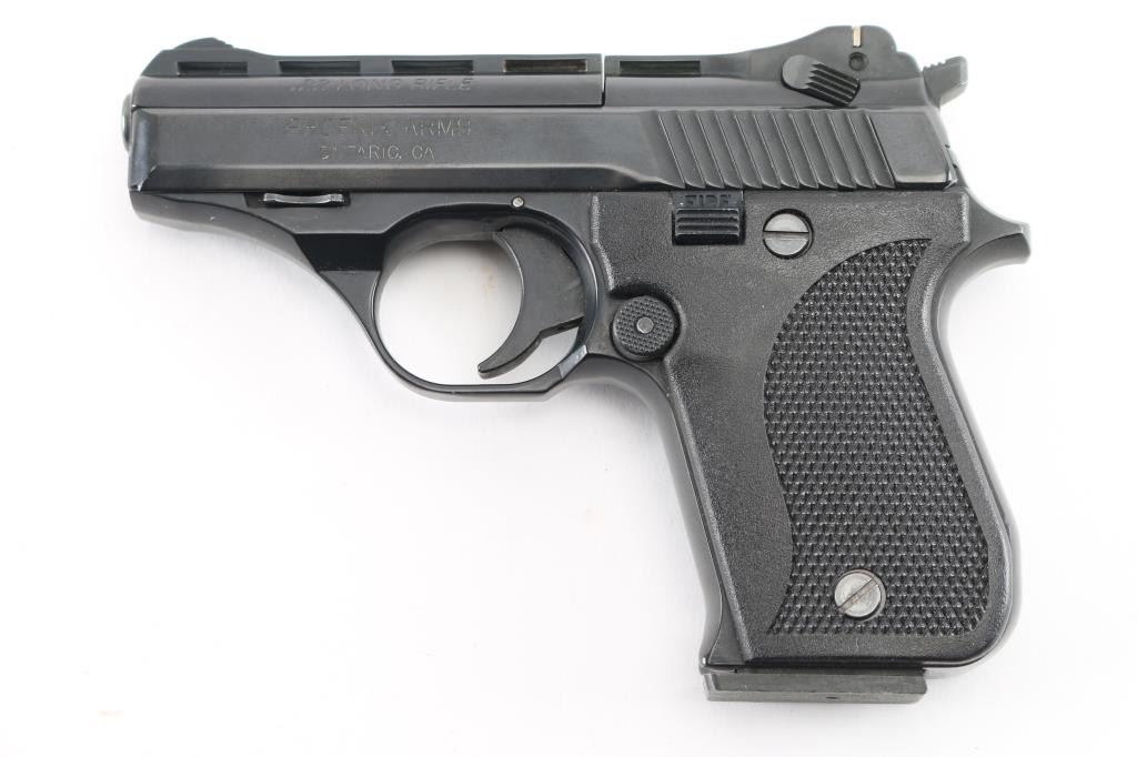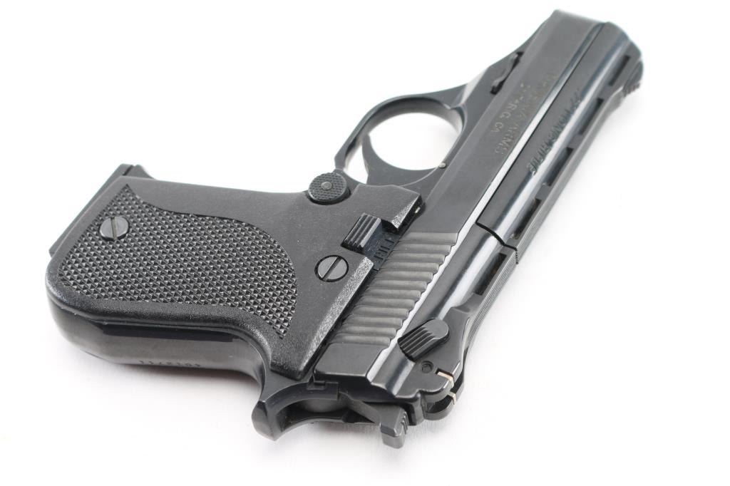 American made, semi-automatic compact single-action pistol chambered in .22 LR with a polished black finish, 3" ventilated and serrated rib barrel with a ramp front sight and adjustable rear sight with metal square-notched insert, checkered black polymer grips and a smooth trigger. Serrated hammer spur, manual thumb safety/slide lock on the left and a slide-mounted firing pin block. Magazine release blocked unless slide is to the rear. Bore is excellent. Retains 98% of it's finish with some marring on the right grip. Comes with (4) 10 rd magazines, factory cardboard box with manual. Condition is NRA Excellent *Modern Firearm*