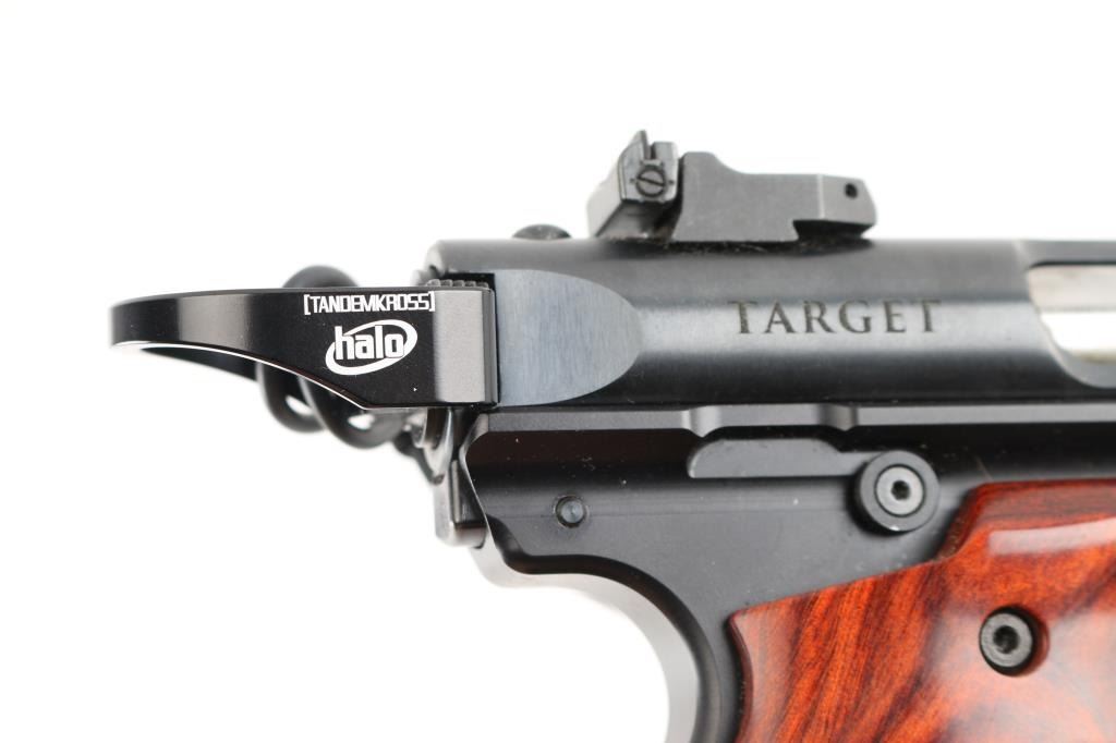 Upgraded semiautomatic pistol features 5.5" bull barrel, one button take-down, raised red fiber optic front sight adjustable square notch target type sights, single action trigger, frame mounted manual safety. Volquartsen trigger system installed, All black finish, alloy frame, smoothly contoured wood laminate grips with wrap around finger grooves, Halo charging ring (These retail for about ($50.00). Bore is excellent condition. Overall external condition is like new, with little evidence of handling. Includes original factory cardboard box, manual, cable lock, two magazines (*3) total, Brownell red mag loader. extra front sight, original Ruger grips with medallions, the Ruger trigger system. weaver style optics base with screws, and a HiViz tube of different colored fiber optic inserts for sights.. Condition is NRA Perfect in Box. Modern Firearm.
