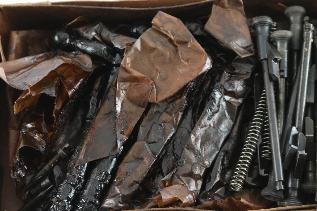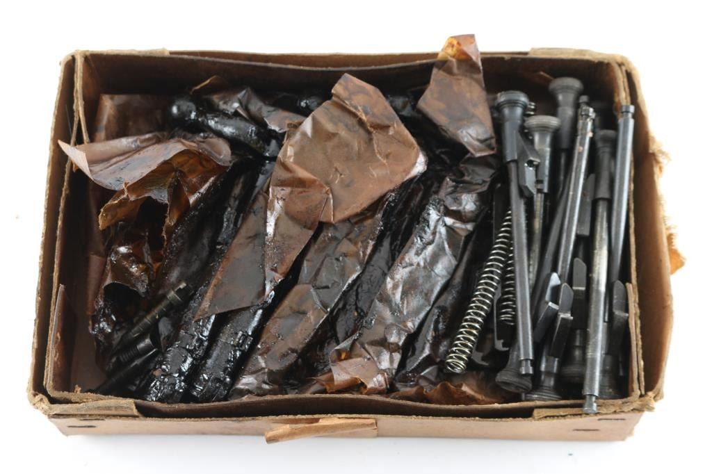 twelve New Old Stock bolt bodies with extractor collars, packed in grease. Also some internal parts, and extractors.