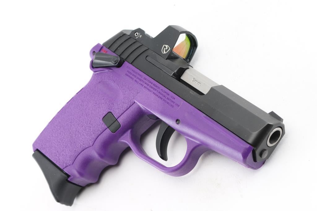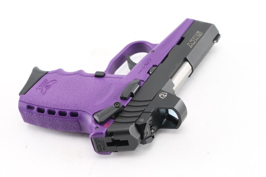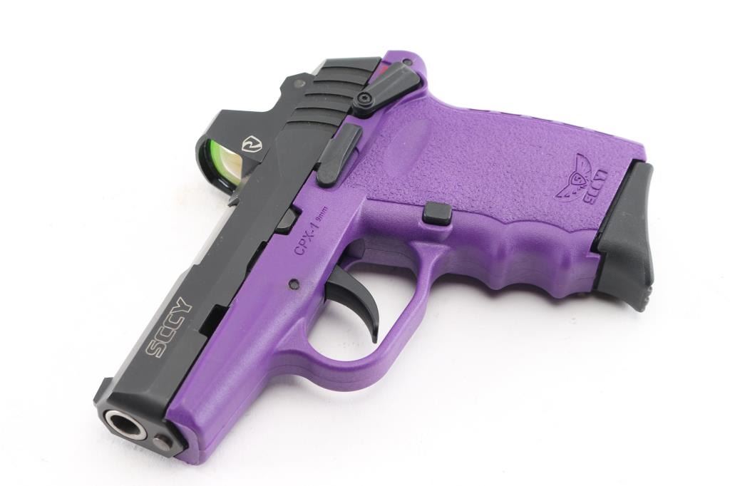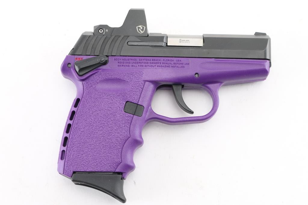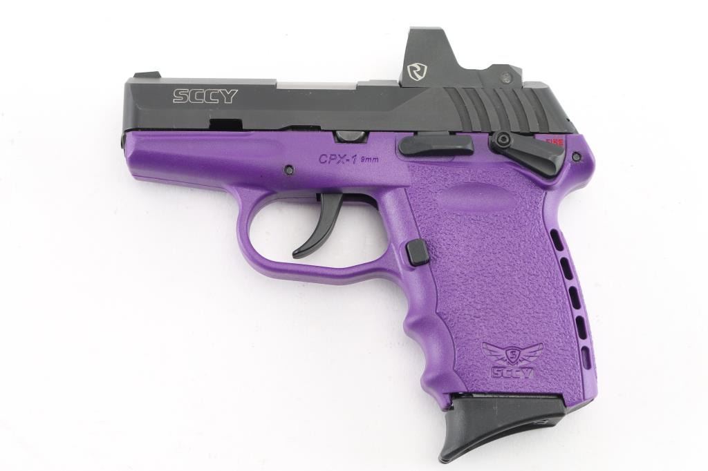 Made in America, the CPX-1 is a compact, hammer-fired, DAO pistol chambered in 9mm. It features a 3" barrel, stainless steel slide, purple polymer frame, dot white sight, a CT rear optic sight is installed on the slide. A 9lb trigger pull. Metal finish looks great, frame looks great. Bore looks very good. Overall gun looks near new.. Condition is NRA Excellent. Modern Firearm.