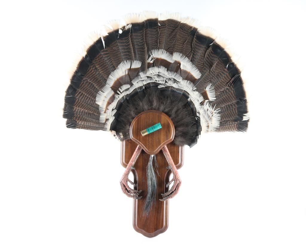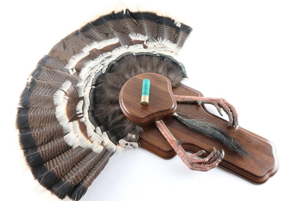 includes tail feathers, beard, claws. Measures 32" x 9". Very good condition.