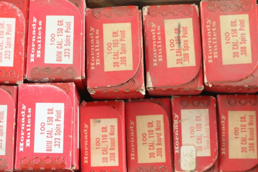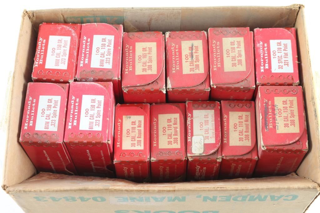 over 25 pounds of bullets. Not loaded ammo. Various weights, 8mm, 30 cal, one box of 32 cal. 14 Boxes, appear mostly full.