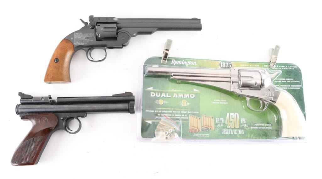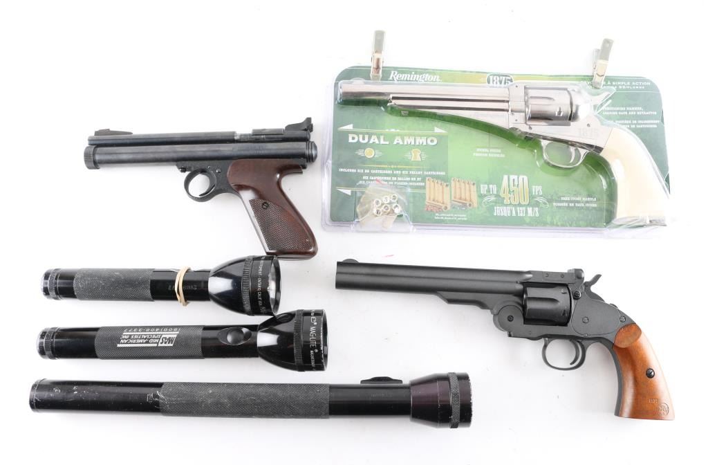 1) Remington RR1875 .177 Cal. nickel finish with 6 pellet and 6 BB cartridges 2) Bear River Schofield 1877 .177 Cal w/ cartridges. 3) Crosman 157 .177 Cal. 4) 3 Mag-lite flashlights, 9", 11" & 16" black aluminum body. All air guns in good condition no boxes.