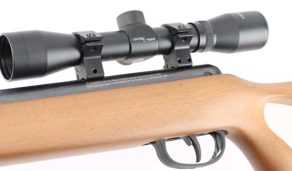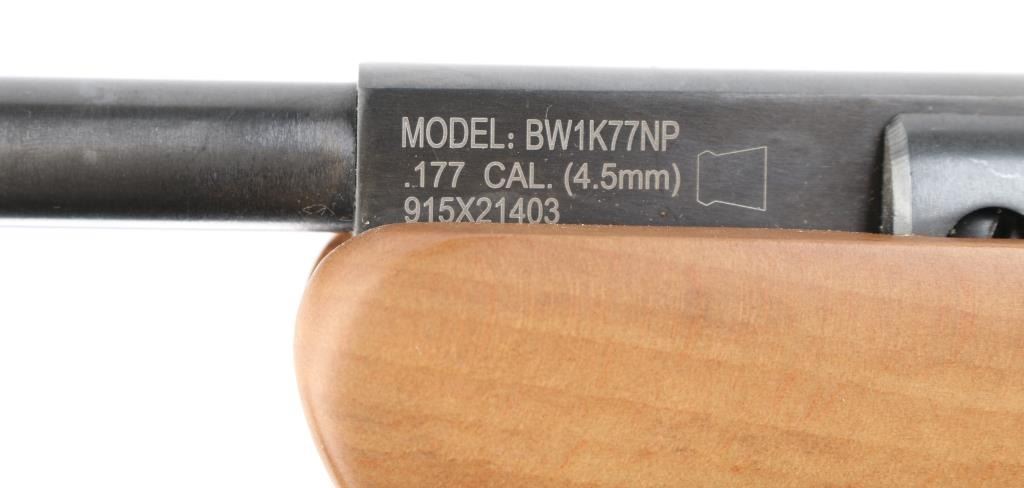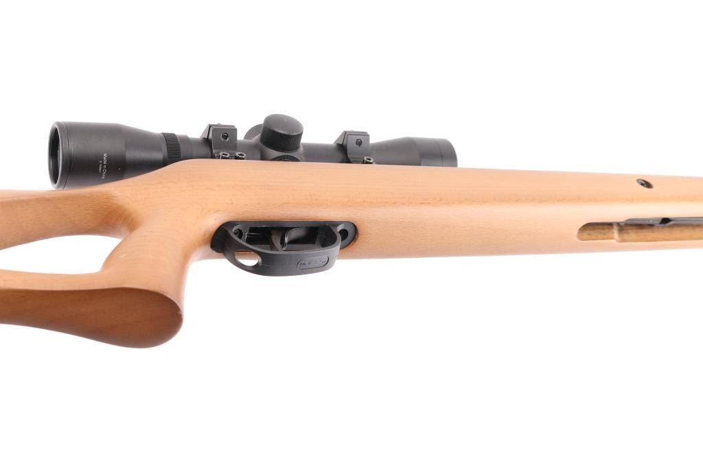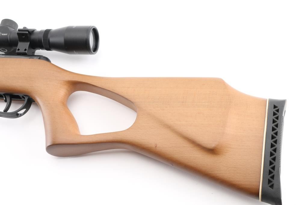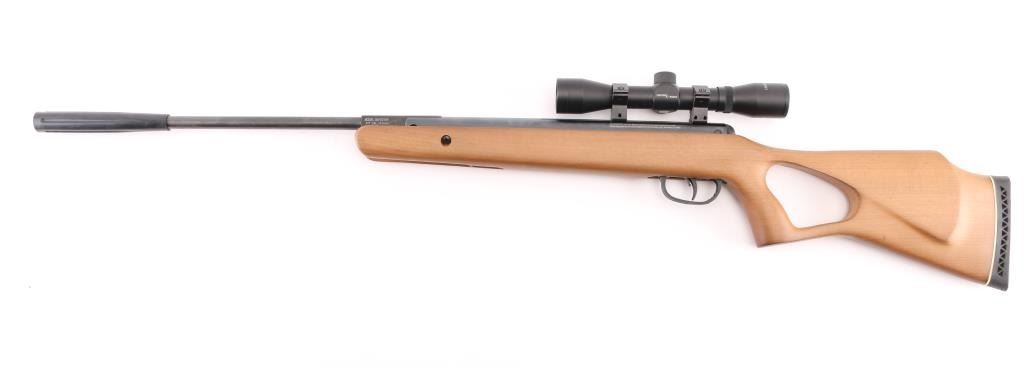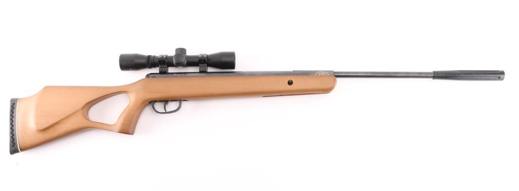 Nitro piston powered, break barrel air rifle chambered in .177 Cal. (4.5mm). 18 1/2" steel barrel with no sights and 6 1/4" rubber front end barrel shroud, smooth wood thumb hole stock with a serrated black rubber recoil pad. Blue finish and wood stock are in excellent condition. Bore is excellent. Comes with Center-point 4 X 32 scope with clear lens. Condition is NRA Excellent. Modern Firearm.