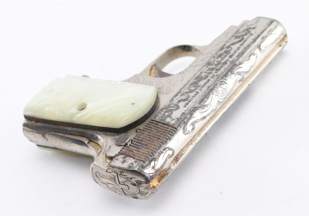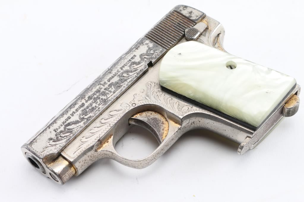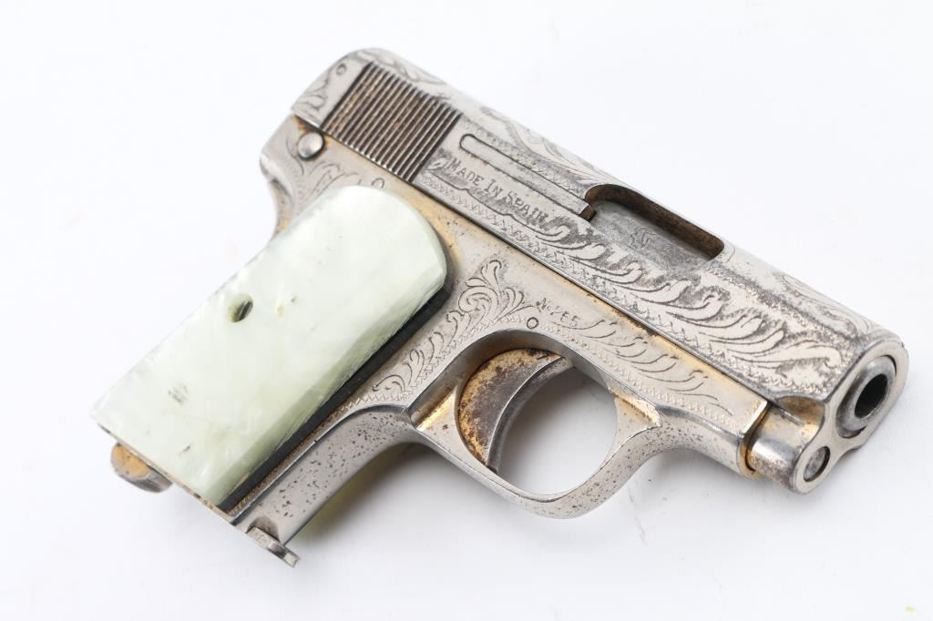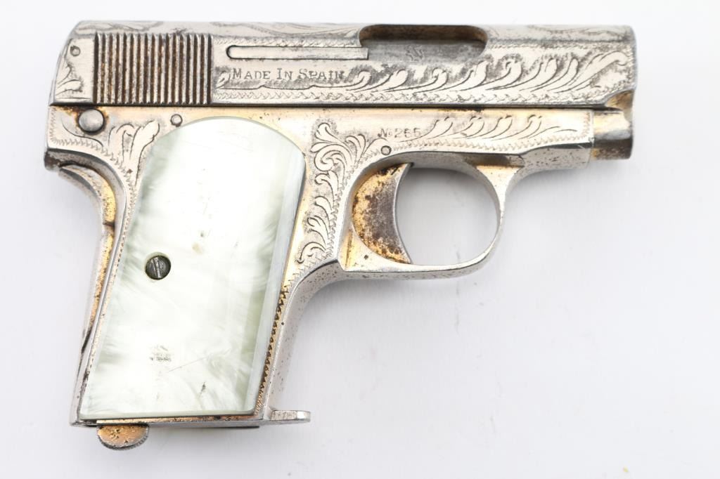 Spanish semiautomatic pistol, probably manufactured in the period between the World Wars. No date code indicates pre-1927. Features floral pattern engraving throughout, silver color plated finish, plastic faux pearl grips, 2.5" barrel, fixed sights, grip safety, manual safety also assists in disassembly, heel magazine catch. Bore is fair to good condition, with frosting and light pitting, slight erosion of rifling. Finish appears to have been gold wash over nickel, with traces of gold color remaining in protected areas, overall fair to good condition with patina and other losses. Grips are very good condition. Includes one magazine. Condition is NRA Good+ *** C&R Firearm ***
