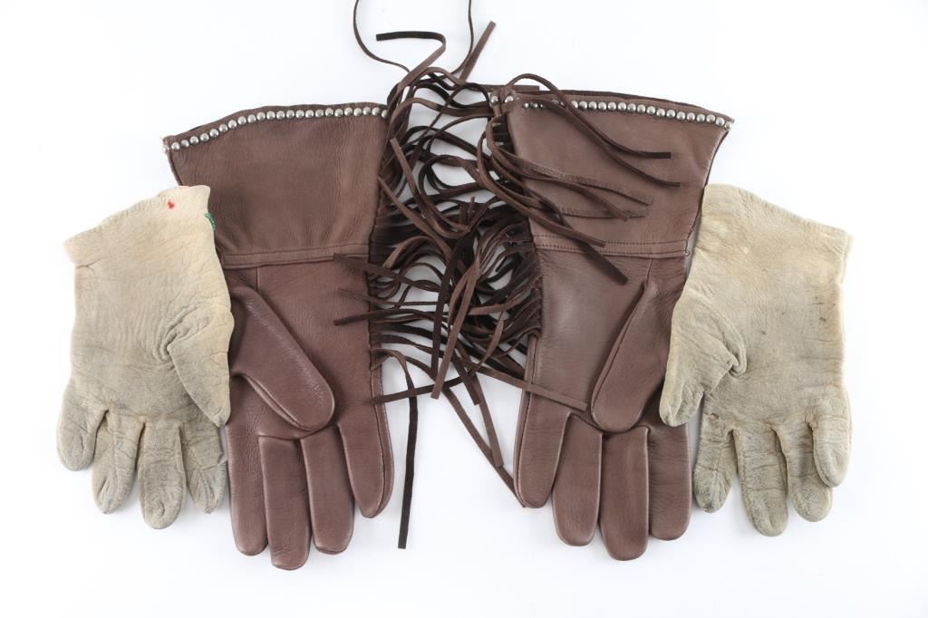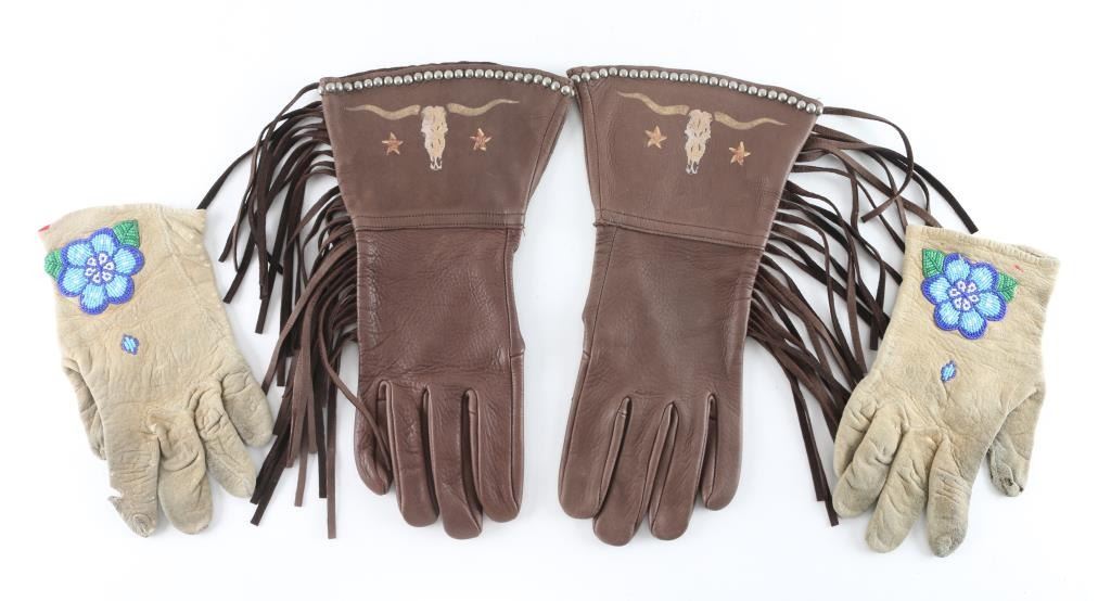 Includes older pair of floral beaded leather gauntlets, an a pair of chocolate brown leather gauntlets, made by "Patricia Wolf", with steer head design and fringe.