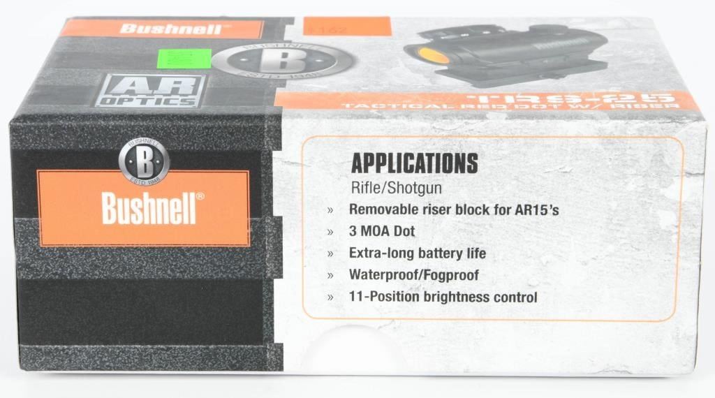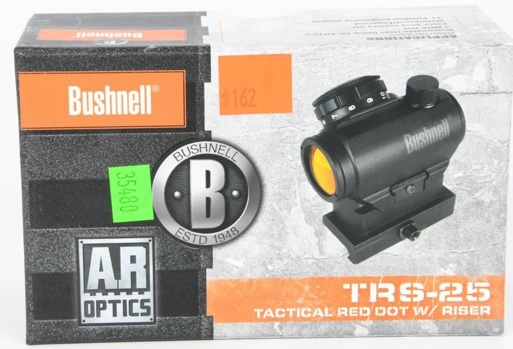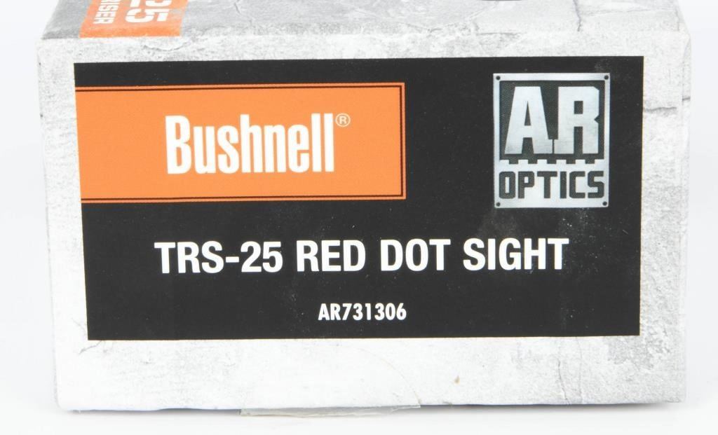 New Bushnell TRS-25 HiRise Red Dot Sight 1x25mm, The Bushnell TRS-25 HiRise Red Dot Sight provides impressive aiming enhancement at a mere six ounces. The TRS-25's brilliance is in its simplicity of use, making it a great choice for shooters of all skill levels. The Bushnell sight features a 3 MOA red dot for precision shot placement and eleven brightness settings for optimum illumination in any light condition. While the TRS-25 is optimized for the Savage Arms MSR (Modern Sporting Rifle) Series, the supplied riser block positions the sight at optimum height on any AR-15 flat tops or tactical shotguns. Features and Specifications: Manufacturer Number: AR731306 Magnification: 1x Objective Lens Diameter: 25mm Lens: Multi-Coated, Amber-Bright High Contrast Field Of View: Unlimited Eye Relief: Unlimited Parallax: Fixed Exit Pupil: 22mm Adjustment Range: 70 MOA Total For Windage And Elevation MOA Adjustment: 1/2 MOA Per Click Reticle Type: 3 MOA Dot Reticle Color: Red Mounting Length: 1.1" Dimensions: 2.4"L Weight: 6.3 oz Water-, Fog- And Shock-proof Finish: Matte Black Includes Riser Block