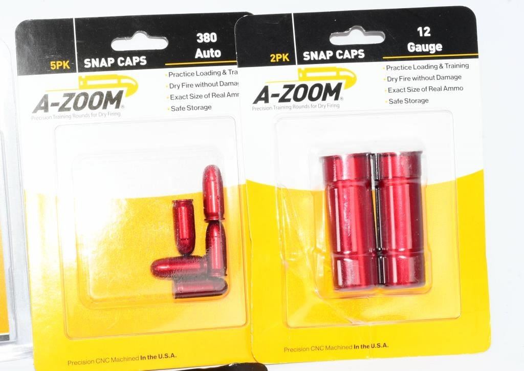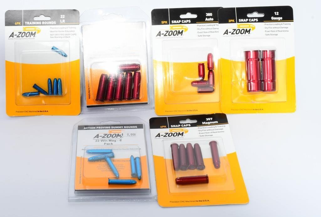 Greetings, firearm enthusiasts! Elevate your training experience with this exclusive assortment of A-Zoom Snap Caps. This unopened package features 6 new packs, each containing precision-engineered snap caps for a variety of calibers. This comprehensive set includes snap caps for the following calibers: 12 Gauge, .22 LR, .22 Win Mag, .380 Auto, .44 Magnum, and .357 Magnum. Whether you're a seasoned shooter or just starting, these snap caps are indispensable for safe and effective firearm handling practice. Bid confidently on this diverse collection of A-Zoom Snap Caps, specifically designed for different calibers. Enhance your training routine and ensure the longevity of your firearms with these reliable and durable snap caps. Don't miss this opportunity