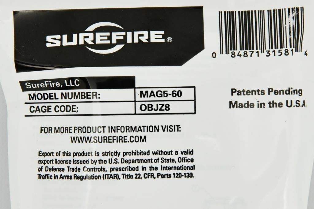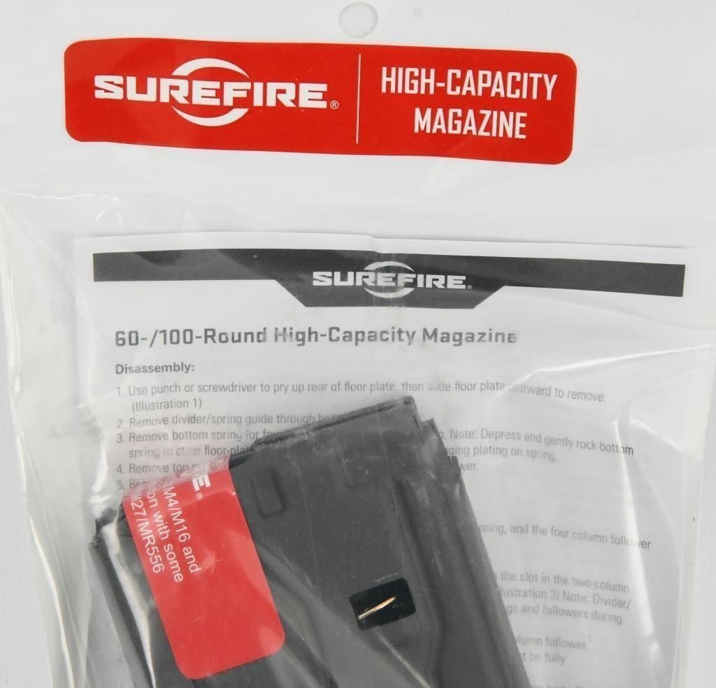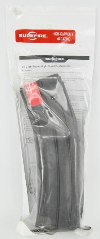 SUREFIRE 60 Round Metal High Capacity Magazine Brand NEW SUREFIRE MAG5-60 High-Capacity Magazine, 60 Round BRAND NEW FACTORY SEALED! Specifications Length 8.70 inches Width 1.66 inches Weight Empty 6.4 ounces Weight Loaded 2.02 pounds MAG5-60 84871315814 The SureFire high-capacity magazine for 5.56x45 mm (.223 Remington) ammunition,, is compatible with M4/M16/AR-15 variants and other firearms that accept standard STANAG 4179 magazines. Constructed from Mil-Spec hard-anodized aluminum, they feed smoothly and reliably due to optimal geometry, non-binding coil springs, and ingenious nesting polymer followers. The long-lasting springs are cadmium coated for low friction and excellent corrosion resistance. Magazines require no lubricants and can be easily disassembled without tools for cleaning. SureFire High-Capacity magazines provide distinct tactical advantages: increased initial firepower in ambush situations; fewer reloads overall, which means less downtime and target distraction in a firefight; fast and easy magazine insertion, even with a closed bolt; less bulk compared to drum mags, enabling a normal weapon grip. The 60-round magazine?slightly thinner than two 30-round magazines clipped together and about the same overall length?fits in most dual magazine pouches, eliminating special carry pouches required for drum magazines. NSN: 1005016112183 Features Compatible with all weapons that accept standard STANAG 4179 compliant magazines Reliable functioning due to mechanical simplicity and high-quality non-binding coil springs?no lubricants required Long-lasting springs are cadmium coated for low friction and excellent corrosion resistance Easily seated in weapon with bolt forward May be kept fully loaded for extended periods without spring fatigue Only 1.66" thick, less than two 30-round magazines clipped together 60-round magazine is approximately same length as two 30-round magazines clipped together 60-round magazine fits in most dual-mag pouches..