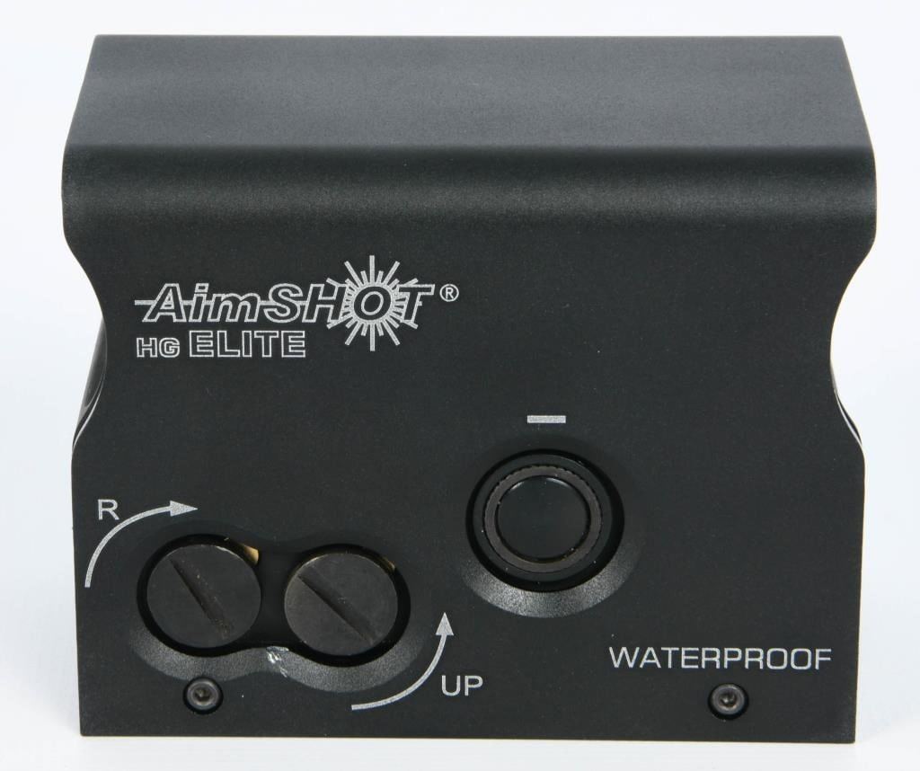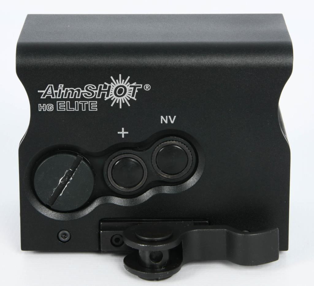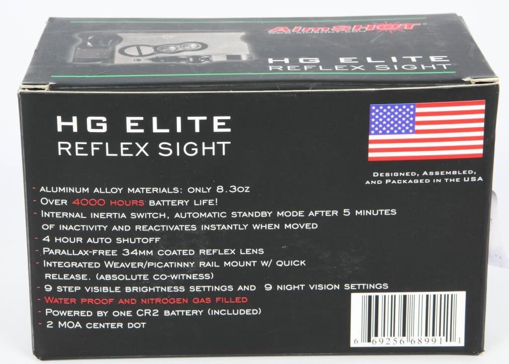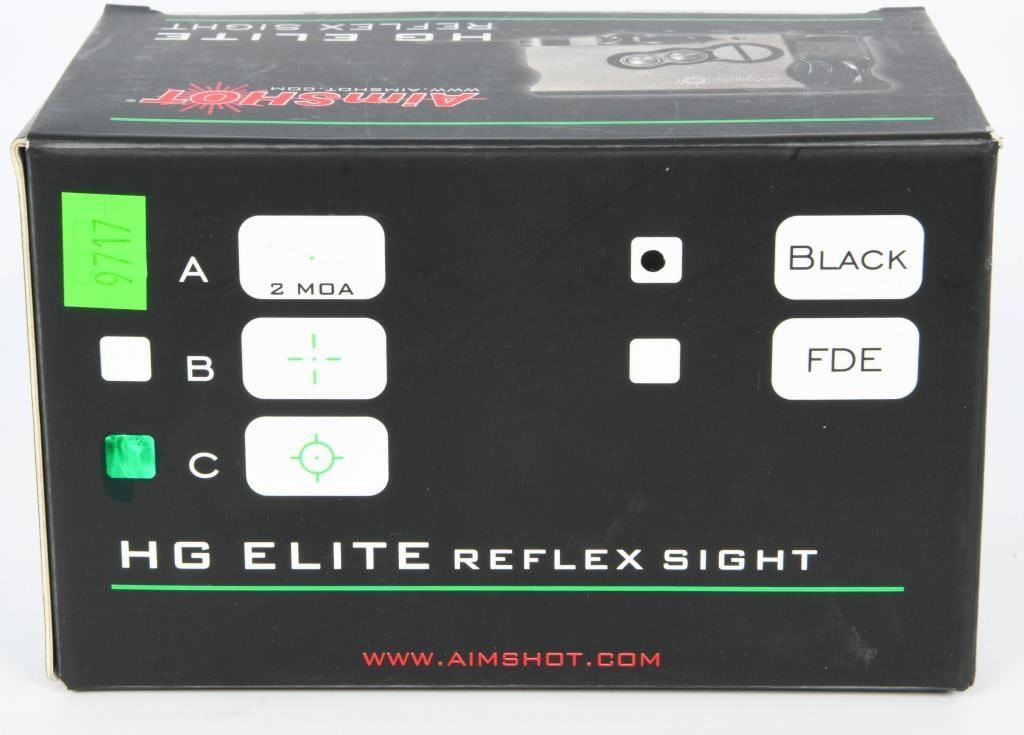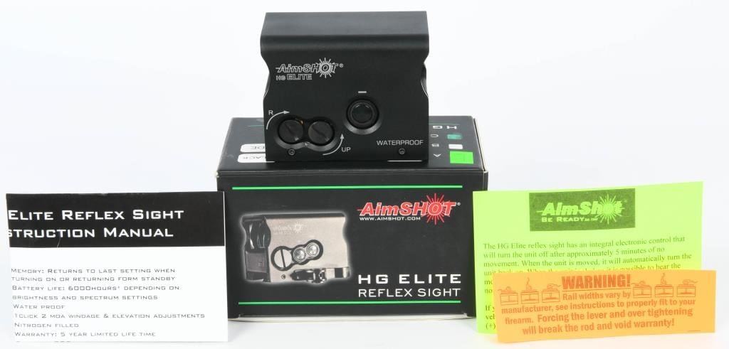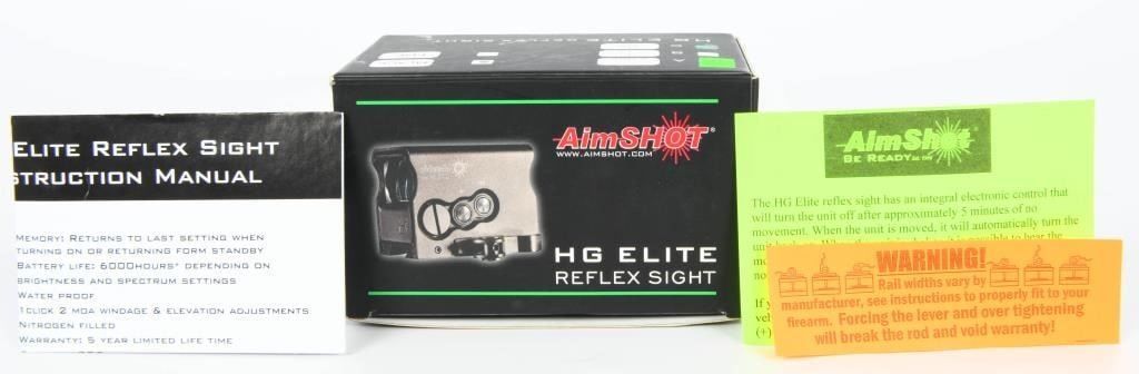 New In The Box AimShot HG Elite Reflex Sight Green Circle with Dot The AimShot HG Elite allows operators to acquire targets with high precision accuracy in any condition. The true 2 MOA center crosshair is easy to acquire and customizable for any situation. The strength, technology, and durability of the HG Elite tilts the situation in the operators favor; it is balance across all shooting platforms with the precision to give the operator total control. Specifications and Features: Green Circle with Dot Integrated quick release picatinny rail mount Nitrogen filled 9 step digital brightness (green) control with night vision mode (9 step true IR) Parallax free 34mm optical lens Over 40,000 hour battery life Built in Inertia switch turning the sight off after 5 minutes of inactivity Waterproof True 2 MOA center dot Body machined from 6061 T6 aluminum 8.2 ounces Runs on one CR2 Battery