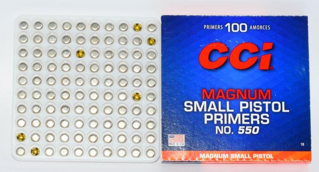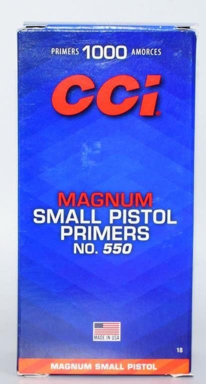 Up Next is a Lot of 1000 CCI Small Pistol Magnum Primers #550, CCI Primers are continuously tested and improved. As a result today's CCI primers are more sensitive, easier to seat and more compatible with progressive and automated loading equipment than ever before. They utilize modern non-corrosive and non-mercuric initiator mixes for the cleanest burn possible. Some real-world shooting conditions require more aggressive initiation than provided by standard primers. Large cases, cold weather, and certain propellants often require a hotter primer flame and a longer burn. CCI Magnum primers offer you that edge, plus you get all the attributes that make all CCI primers so great. NO HAZMAT FEES!!!