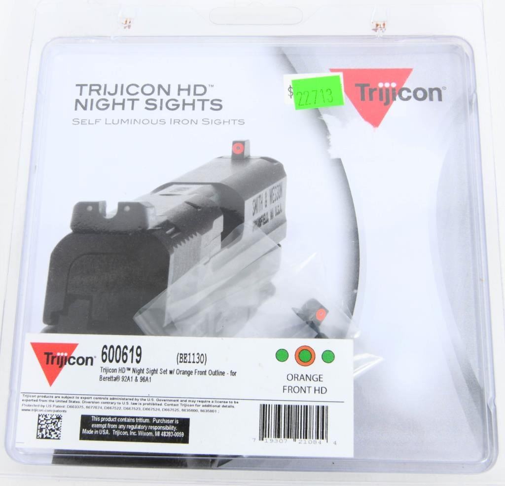 New Trijicon Beretta 92/96A1 HD Night Sight Set Orange Front Outline BE113O The Trijicon Beretta 92/96A1 Hd Night Sight Set-Orange Front Outline BE113O Gun Make: Beretta, Gun Model: Beretta 92, Beretta 96A1, Color: Black, Orange, Front Sight Color: Green w/ Orange Outline, Rear Sight Color: Green w/Black Outline, Fabric/Material: Metal, Front Material: Tritium/Paint, Gun Type: Pistol, Attachment/Mount Type: Professional installation recommended., Front Blade Height: 0.215 in, Rear Blade Height: 0.231 in