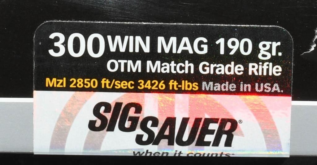 Secure 40 rounds of Sig Sauer Elite .300 Win Mag ammunition, featuring OTM Match Grade rifle ammo with a 190-grain projectile. Crafted with precision and designed for optimal performance, this ammunition is ideal for those seeking high-quality rounds for precision shooting and match-grade accuracy. Made in the USA, Sig Sauer is a trusted name in firearms and ammunition, known for its commitment to excellence. The 190-grain Open Tip Match (OTM) design ensures consistent and reliable performance, making it suitable for both range practice and competitive shooting. Bid confidently on this opportunity to acquire 40 rounds of Sig Sauer Elite .300 Win Mag ammo and enhance your shooting experience with match-grade accuracy. Note: Please ensure compliance with local and state regulations regarding the purchase and possession of ammunition.