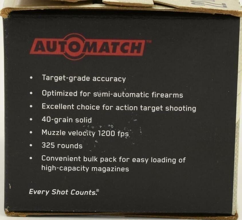 325 Rounds Federal Auto Match .22 LR Ammunition 325 Rounds 40 Grain Lead Round Nose 1200fps Federal Auto Match Target is a rimfire ammunition line specifically designed for use in conjunction with semi-auto firearms. Like with all Federal products, Auto Match provides you with a reliable feeding cartridge which will function in a wide variety of firearms including picky ones Manufacturer Number: AM22 .22 Long Rifle 40 Grain Lead Round Nose Muzzle Velocity 1200fps Muzzle Energy 128 ft/lbs Made in the USA Uses: Target Shooting, Training, and Plinking