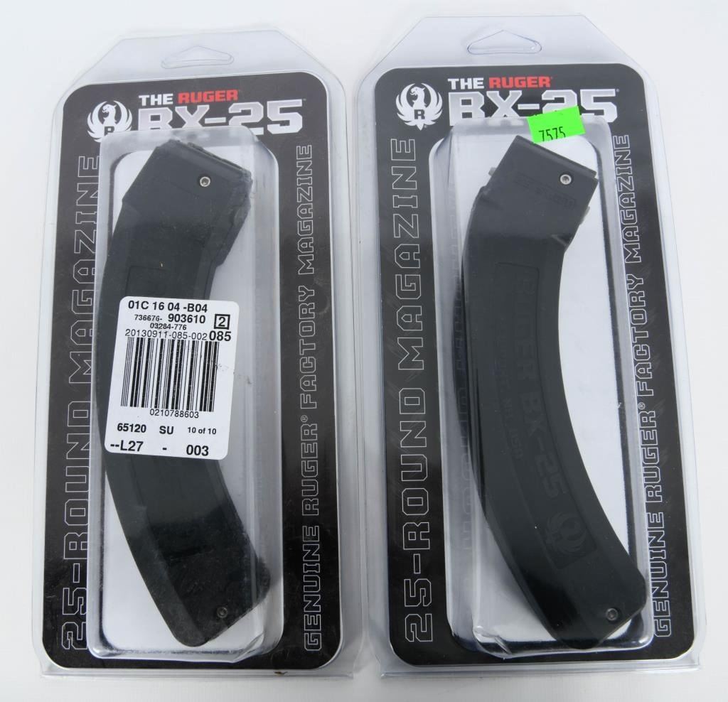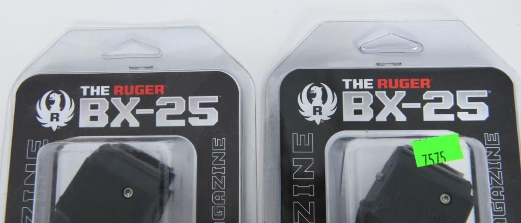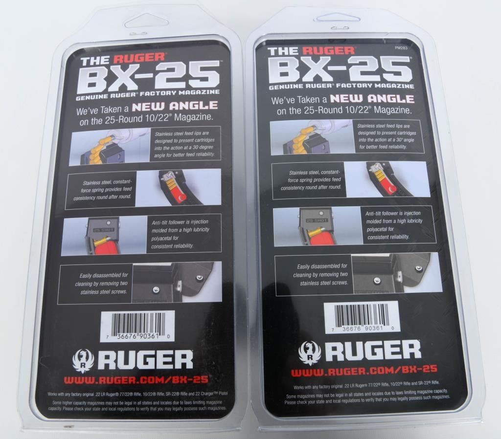 LR; 2 New In Package Ruger 10/22 BX-25 Magazine .22 LR Ruger 10/22 Magazine BX-25 .22 LR 25rd Black 90361; The BX-25 genuine Ruger factory magazine has been tested and proven to feed as reliably as the standard BX-1 10-round Ruger rotary magazine. The BX-25 features a stainless steel constant-force spring that provides feed consistency round after round. It is compatible with any factory original Ruger 10/22 rifle, SR-22 rifle, and 22 Charger. This model has a black finish. 25 Round Capacity, Know Your State Laws Before Bidding On High Capacity Magazines
