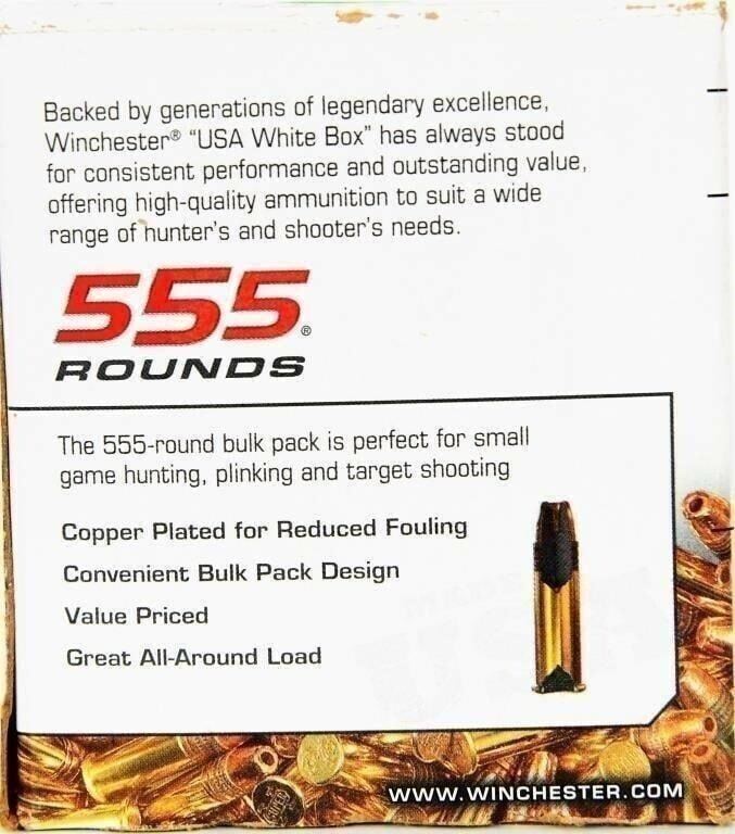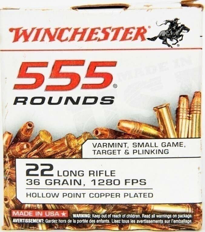 555 Rounds Of Winchester .22 LR Ammunition 555 Bulk .22 LR 36 Grain Plated HP 555 Round Box Winchester .22 Long Rifle ammunition with its 36 Grain Copper Plated Hollow Point at 1280 fps is excellent for target shooting, plinking and small game hunting. It's a consistent and proven performer that's suitable for any small caliber rimfire application. The hollow point design provides excellent expansion and the copper plating reduces fouling. The Winchester 555 Round box is a convenient economical value priced bulk pack. Winchester 222 Rounds 22LR555HP .22 Long Rifle, 22 LR 36 Grain Copper Plated Hollow Point Muzzle Velocity: 1280 fps. Velocity at 100 yards: 975 fps Muzzle energy: 94 ft/lbs. Energy at 100 yards: 76 ft/lbs Uses: Target Shooting, Plinking, Small Game and Varmint Hunting