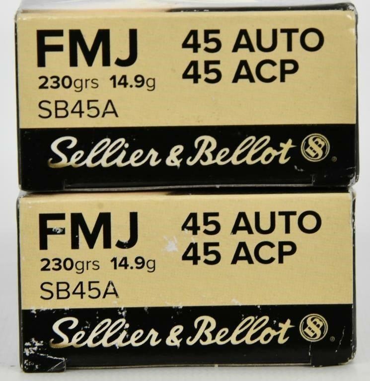 100 Rounds Of Sellier & Bellot .45 ACP Ammunition 230 Grain FMJ 853 fps This Sellier & Bellot .45 ACP ammunition features a full metal jacket projectile for improved reliability and penetration. The 230-grain bullet is capable of traveling at 853 fps, producing 372 ft/lbs of energy at the muzzle. This ammunition is a great choice for target shooting, match use and plinking at the range. When you need dependable ammunition you can count on, you can trust in Sellier & Bellot. Sellier & Bellot is one of the oldest ammunition manufacturers in the world. S&B was established in 1825 by Louis Sellier and Jean Maria Nicolaus Bellot in Prague, producing percussion caps. In 1918, the company began loading 9mm cartridges. Moving to Vlasim, Czechoslovak in 1945 allowed for future growth into additional calibers of ammunition. Sellier & Bellot .45 ACP Ammo Features and Specifications: Caliber: .45 ACP (Automatic Colt Pistol) Bullet Type: Full Metal Jacket (FMJ) Bullet Weight: 230 Grains Rounds: 50 Rounds Per Box Muzzle Velocity:853 fps Muzzle Energy: 372 ft/lbs Bullet Diameter:0.451" Casing: Brass Bullet Ballistic Coefficient: 0.115 Primer Style: Boxer Accurate Positive Functioning No Barrel Leading No Expansion Usage: Target, Match, Range and Plinking