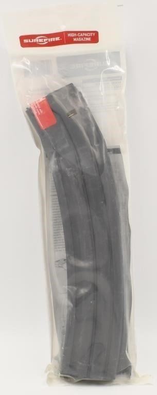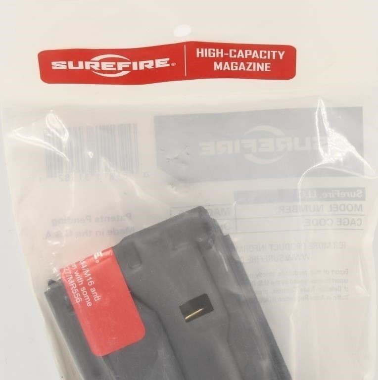 The SureFire high capacity magazine for 5.56x45 mm (.223 Remington) ammunition is compatible with M-4, M-16 and AR-15 variants and other firearms that accept STANAG 4179 (standard M16) magazines. Constructed from Mil-Spec hard-anodized aluminum, they feed smoothly and reliably due to optimal geometry, non-binding coil springs, and ingenious nesting polymer followers. The long-lasting springs are cadmium coated for low friction and excellent corrosion resistance. Magazines require no lubricants and can be easily disassembled without tools for cleaning. SureFire High capacity magazines provide distinct tactical advantages: increased initial firepower in ambush situations; fewer reloads overall, which means less downtime and target distraction in a firefight; fast and easy magazine insertion, even with a closed bolt; less bulk compared to drum mags, enabling a normal weapon grip. The SureFire 100 round magazine is slightly thinner than two 30 round magazines clipped together and is about the same overall length. The SureFire 100 round magazine fits in most dual magazine pouches, eliminating special carry pouches required for drum magazines. PLEASE NOTE: THESE MAGS ARE NO LONGER IN PRODUCTION AND WILL BECOME VERY LIMITED TO FIND: GET YOURS NOW! (be ready for the apocalypse) Know Your State Laws Before Bidding On High Capacity Magazines