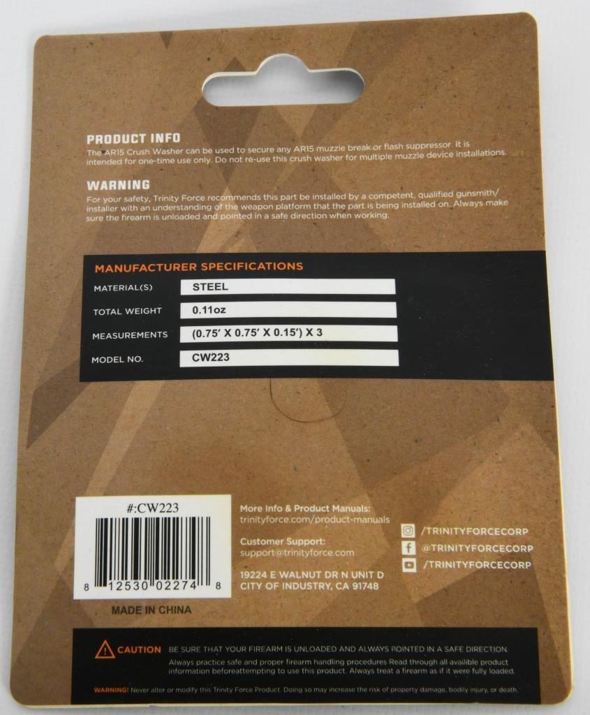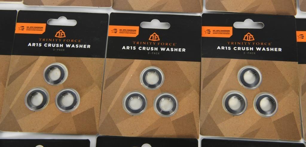 Elevate your AR-15 maintenance capabilities with our exclusive auction featuring 16 new packs of Trinity Force AR15 Crush Washers. Each pack includes three washers, ensuring you have an ample supply for various applications. These crush washers are essential for properly timing and securing muzzle devices, contributing to the accuracy and reliability of your AR-15. Bid confidently on this lot, knowing you are acquiring high-quality crush washers from Trinity Force. With three washers per pack, this set provides flexibility for multiple firearm maintenance needs. Secure this lot and enhance your AR-15 maintenance toolkit with these reliable crush washers. Happy bidding, and may the winning bid bring home these sought-after Trinity Force AR15 Crush Washers to optimize your firearm maintenance. Get your bid on and seize the opportunity to own 16 new packs of Trinity Force AR15 Crush Washers.