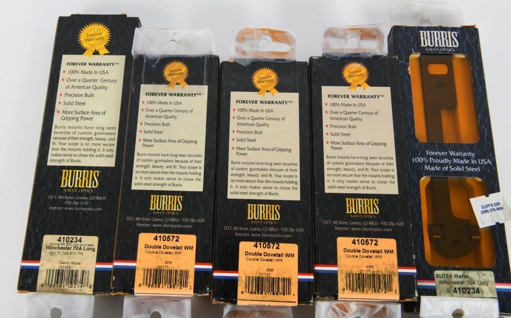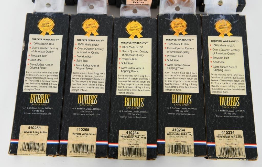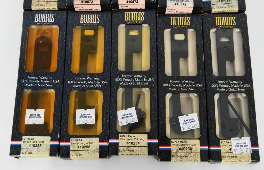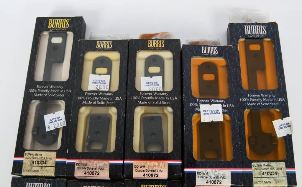Elevate your optics setup with our exclusive auction featuring 10 New in The Box Burris Scope Mount Bases. This lot includes 7 bases crafted for Winchester 70A Long Action and 3 Double Dovetail VM Matte Black Bases, all meticulously designed to Burris's high standards. These scope mount bases are packaged conveniently in individual boxes, ensuring their pristine condition and readiness for installation on your firearms. Bid confidently, knowing you are acquiring a set of 10 high-quality Burris Scope Mount Bases tailored to Winchester and featuring the durable matte black finish. Secure this package to enhance your optics game with the renowned quality and precision of Burris. Happy bidding, and may the winning bid bring home these sought-after scope mount bases for a reliable and accurate optics setup. Get your bid on and seize the opportunity to own 10 New in The Box Burris Scope Mount Bases.