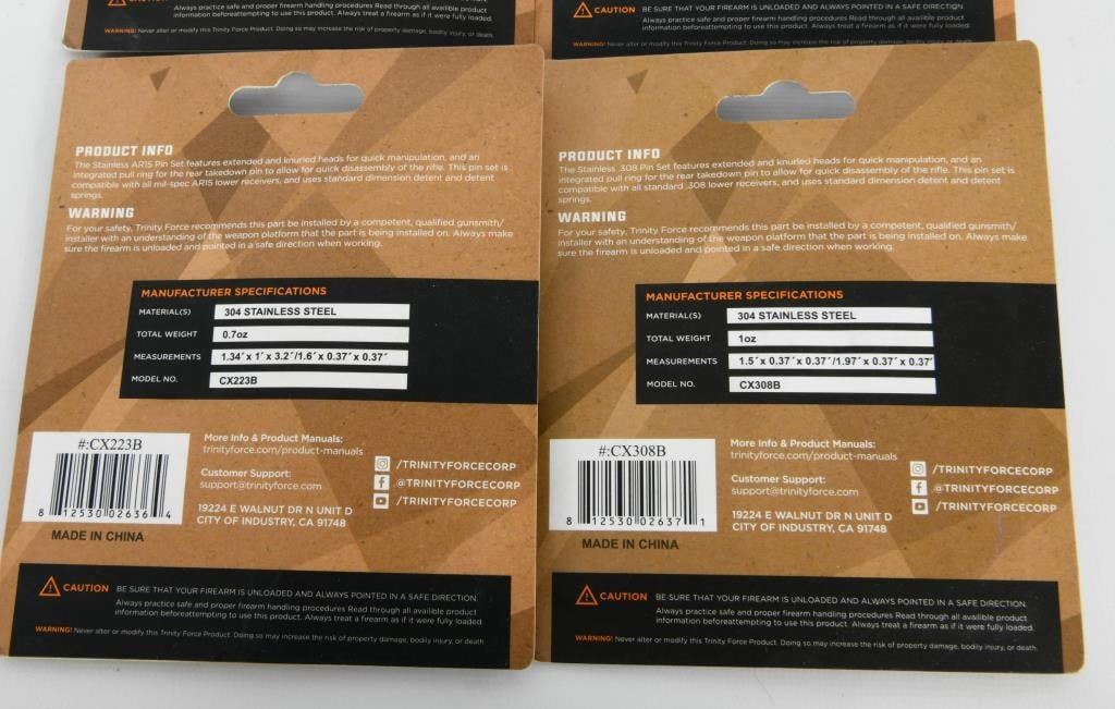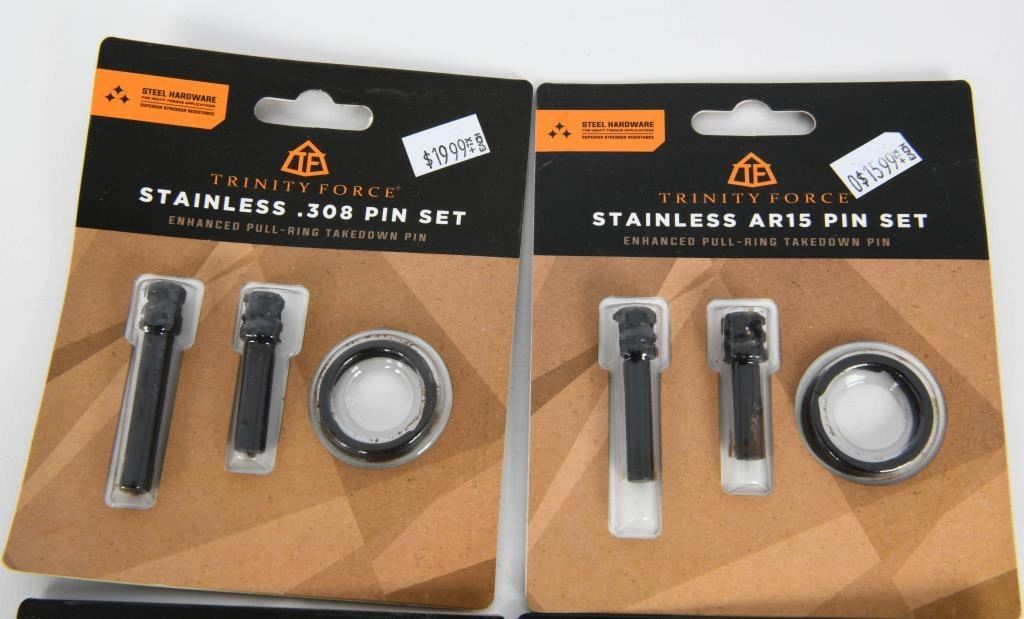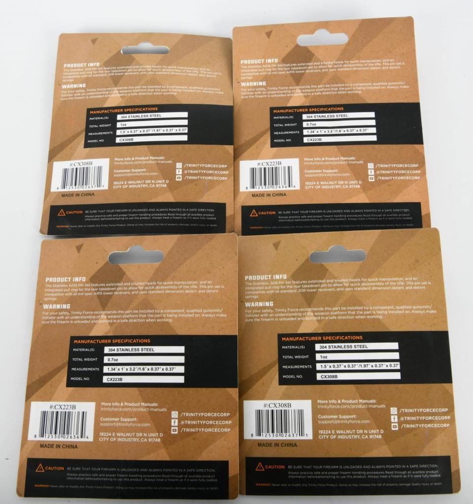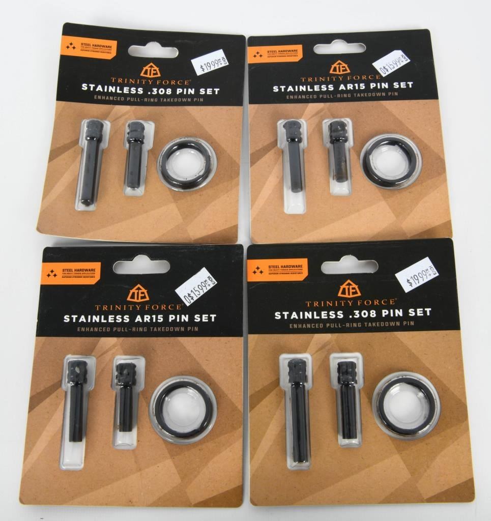 Kits; Upgrade your AR-15 with our exclusive auction featuring 4 New Sets of Trinity Force Stainless AR15 Pin Kits, each including Enhanced Pull Ring Takedown Pins. These pin kits are new in the package, providing enhanced functionality and durability for your firearm. The pull ring design ensures easy and quick disassembly, making maintenance a breeze. Bid confidently on this lot, knowing you are acquiring 4 sets of high-quality Trinity Force Stainless AR15 Pin Kits. Each kit includes enhanced pull ring takedown pins, ready for installation on your AR-15. Secure this package to elevate your firearm's performance with the durability and functionality of Trinity Force pin kits. Happy bidding, and may the winning bid bring home these sought-after pin kits for enhanced disassembly convenience. Get your bid on and seize the opportunity to own 4 New Sets of Trinity Force Stainless AR15 Pin Kits.