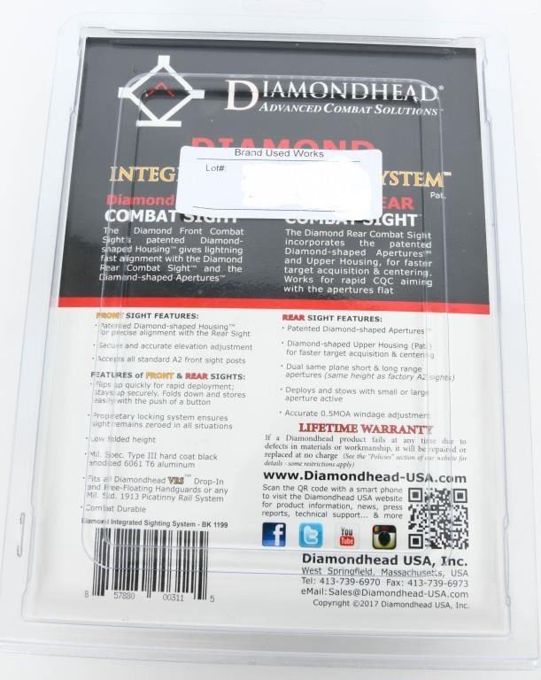 New Diamondhead AR-15 Diamond Flip-Up Sights, Same Plane Aluminum Black 1199 Diamondheads AR-15 Diamond Integrated Flip-Up Sighting System comprises the re-styled Diamond Rear Combat Sight and the Diamond Front Combat Sight. This Diamondhead AR-15 sight system features proprietary diamond shaped apertures for faster target acquisition and centering. This AR-15 rear sight features a very low folded profile that won't snag or interfere with other sights, deploys quickly either of the dual or same-plane apertures and folds down with the push of a button, allowing the shooter to quickly adapt to various situations in a second. The front sight mounts directly to an existing railed gas block at the gas block height. Constructed of 6061 T6 aluminum, this sight is comprised of a Diamondhead premium sight base-of increased height to compensate for the lower gas block-and patented diamond-shaped upper sight housing. This sight deploys quickly, folds and stores easily with the push of a button and stays firmly in place in either state for sturdy combat readiness. Features and Specifications: Manufacturer Number:1199 Rear Sight: Diamond-Shaped Apertures And Upper Housing On A Premium Sight Base Proprietary Reference Posts And Horizon Bars Dual Same Plane Short And Long Range Apertures (At Exact Height Of Factory A2 Sights) Fully Deploys And Stows With Small Or Large Aperture Active Secure And Accurate 0.5 MOA Windage Adjustment Flips Up Quickly For Rapid Deployment Folds Down With The Push Of A Button Locking System Ensures Sight Stays Up Securely And Remains Zeroed In Combat Situations Easy Installation With Proprietary Clamping System Combat Durable Material: Type 111 Black Anodized MIL-SPEC 6061 T6 Aircraft Aluminum Color: Black Dimensions: 0.435"H (Folded) Fits: All MIL-STD 1913 Picatinny Rails Front Sight: Rail Mounted Folding Sight Incorporates The Diamond-Shaped Upper Housing Mounts Directly To A Railed Gas Block, Providing A Secure And Solid Sight Attachment To The Barrel Taller Sight To Compensate For The Below Receiver-Height Gas Block Allows For Sight Stability-Eliminates Potential Handguard Movement And Holds A True Zero Proprietary Diamond-Shaped Housing Frames And Centers The Target With Speed And Ease Easy Installation With Proprietary Clamping System Flips Up Quickly For Rapid Deployment; Stays Up Securely Folds Down And Stores Easily With The Push Of A Button Secure And Accurate Elevation Adjustment Standard A2 Size Front Sight Post Combat Durable Material: MIL-SPEC Stainless Steel / Type 111 Black Anodized 6061 T6 Aircraft Aluminum Construction Color: Black Fits: AR-15 and AR-10 railed gas blocks All MIL-STD 1913 Picatinny rails