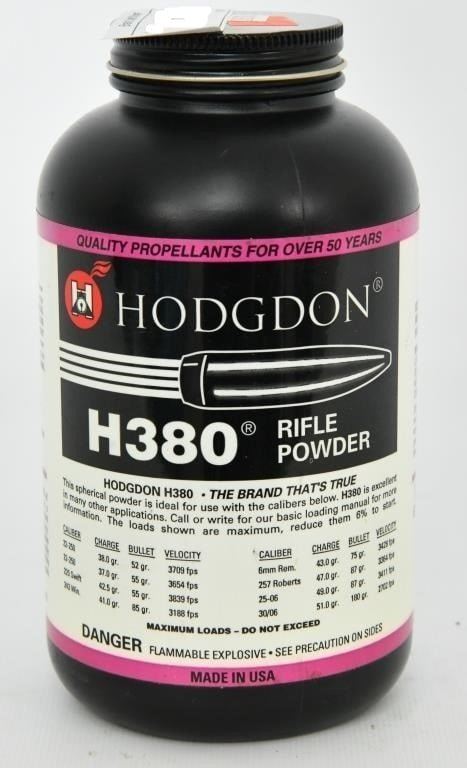 Hodgdon H380 Spherical Rifle Powder 1 lbs When Hodgdon H380 Spherical Rifle Powder was originally used by the company founder, Bruce Hodgdon, it had no name. When one-hole groups were produced from his .22 Caliber Wildcat from a 38.0 charge behind a 52 grain, the powder was officially named. Today, this powder is one of the top choices for reloading .257 Roberts, .220 Swift, and other cartridges used for varmint hunting. This smokeless powder offers high velocity and extreme accuracy. NOTE; No Hazmat Fee