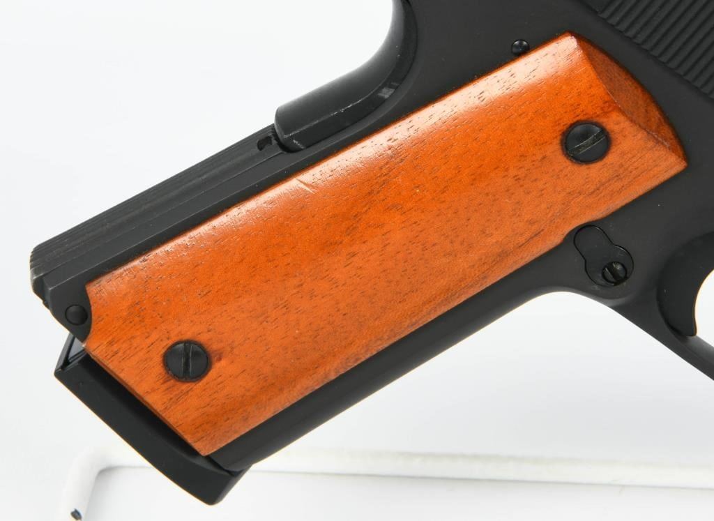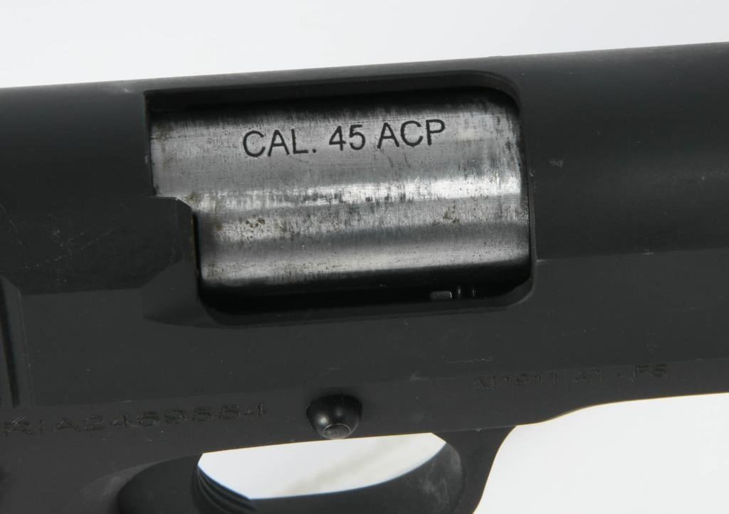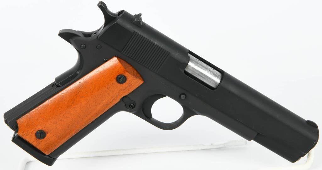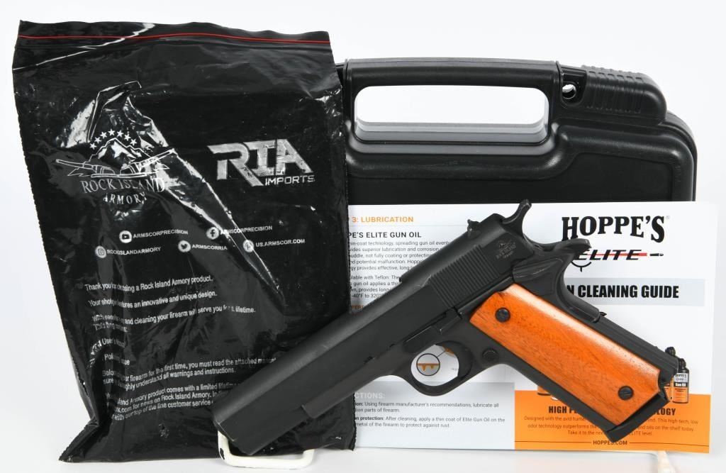 Now available for auction is the Rock Island Armory M1911-A1 Full Size Semi Auto Pistol, chambered in .45 ACP. This classic and reliable pistol comes in the factory hard case with one magazine and paperwork, and it is described as appearing in great condition. The Rock Island Armory M1911-A1 is a full-size semi-automatic pistol, known for its iconic design and chambering in the powerful .45 ACP caliber. It is a popular choice among firearms enthusiasts, appreciated for its accuracy and timeless appeal. This particular pistol is presented in great condition, indicating that it has been well-maintained and cared for. The inclusion of the factory hard case, one magazine, and paperwork adds to the overall value and completeness of the auction item. Bid with confidence on this Rock Island Armory M1911-A1 Full Size, a reliable and classic choice for both range shooting and collection purposes. As always, ensure compliance with all firearm laws and regulations in your area and bid responsibly to secure this quality firearm for your collection or personal use.