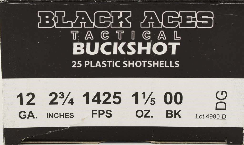 Secure 50 rounds of Black Aces Tactical 12 Gauge 00 Buckshot, designed for home defense or hunting, providing the reliability needed to get the job done. These 2-3/4" shells contain 9 pellets of 00 buck and boast a muzzle velocity of 1425 feet per second. Manufactured by Black Aces Tactical, this ammunition is crafted to offer peace of mind when it comes to home defense or tactical shooting scenarios. The reloadable cases provide added convenience and economy for those who appreciate the option to reload their own ammunition. Bid confidently on this opportunity to acquire 50 rounds of Black Aces Tactical 12 Gauge 00 Buckshot and enhance your preparedness for home defense or hunting needs. Note: Please ensure compliance with local and state regulations regarding the purchase and possession of ammunition.