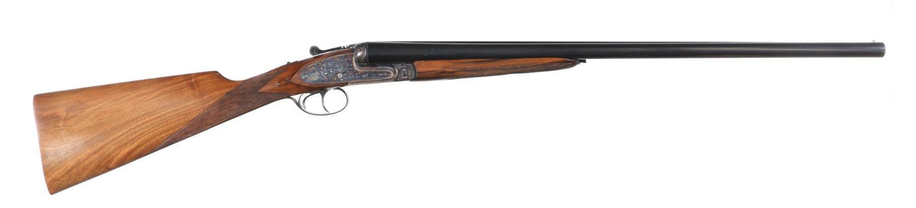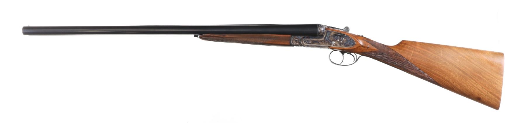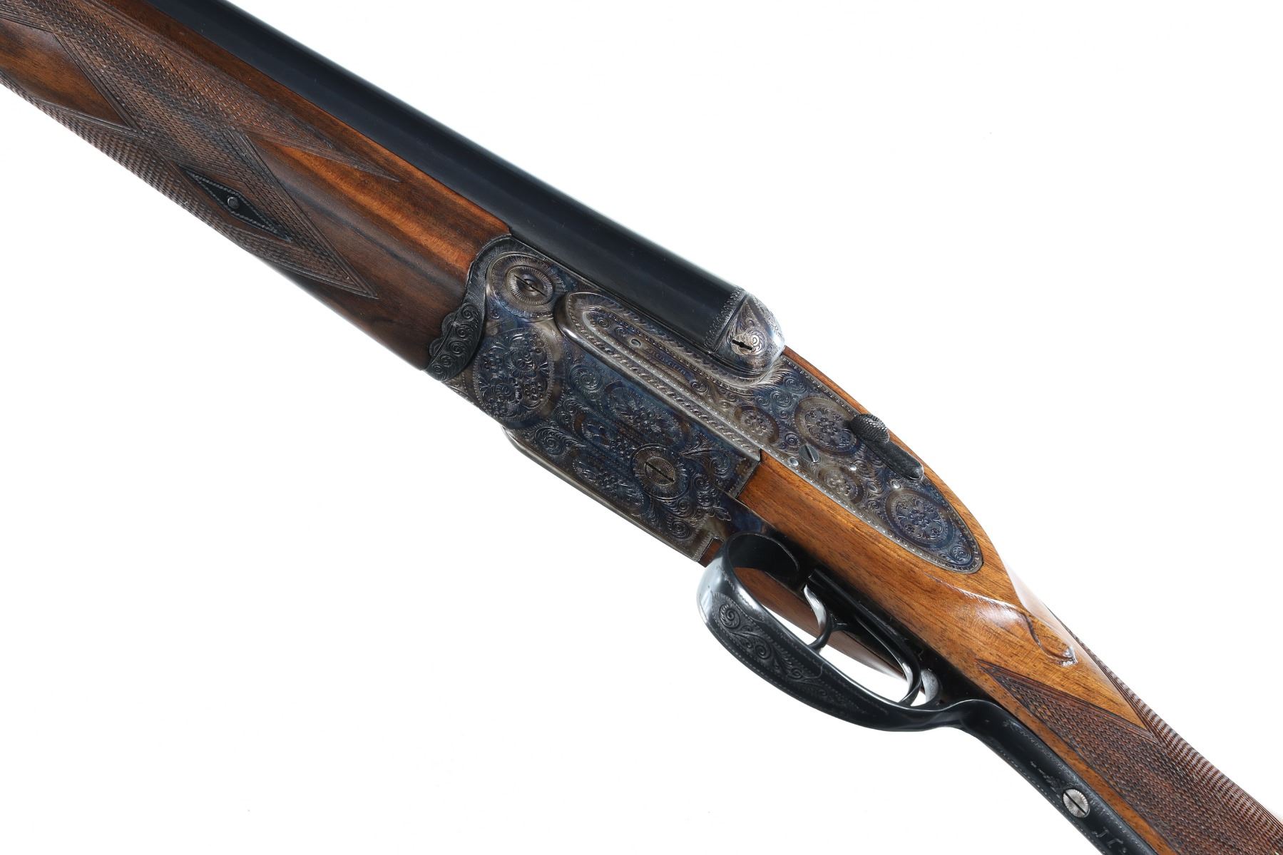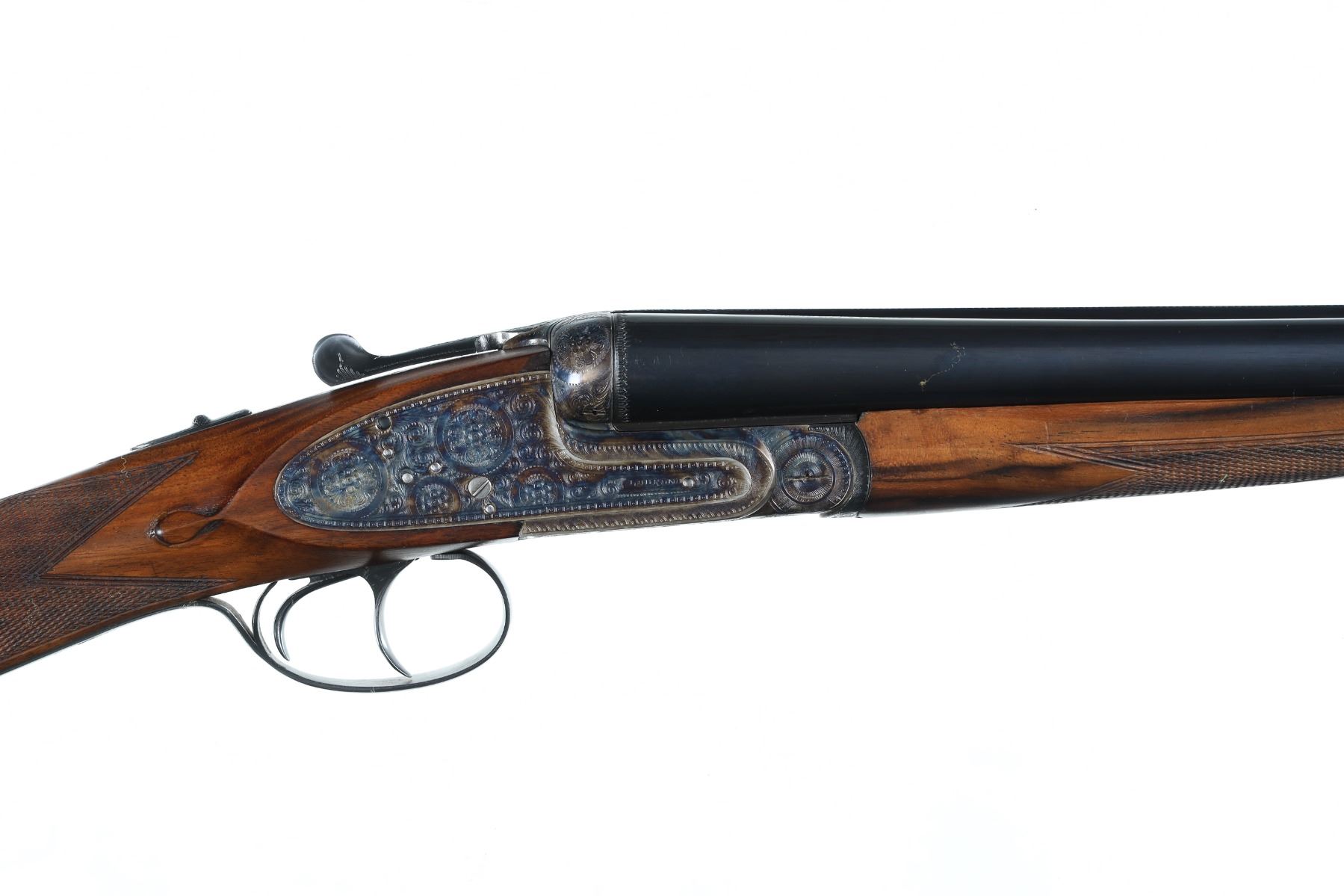 12ga Serial # 148326 Choked Full/Mod, 2 3/4" chambers. Blue finished barrels with machine engine turned faces, 5 pin quick detachable sidelock, locks and receiver are extensively engraved in rows and scroll with cocking indicators and vividly case colored. Trigger bow is deep black finished while stocks are English straight, checkered at wrist, LOP 14 1/2", DAC 1 1/2", DAH 2 1/2". Mfg in 1999. Outstanding quality Spanish double. Excellent overall condition showing little use with some handling, bores are bright, stocks are excellent. Mechanically excellent. Barrel 26" Modern