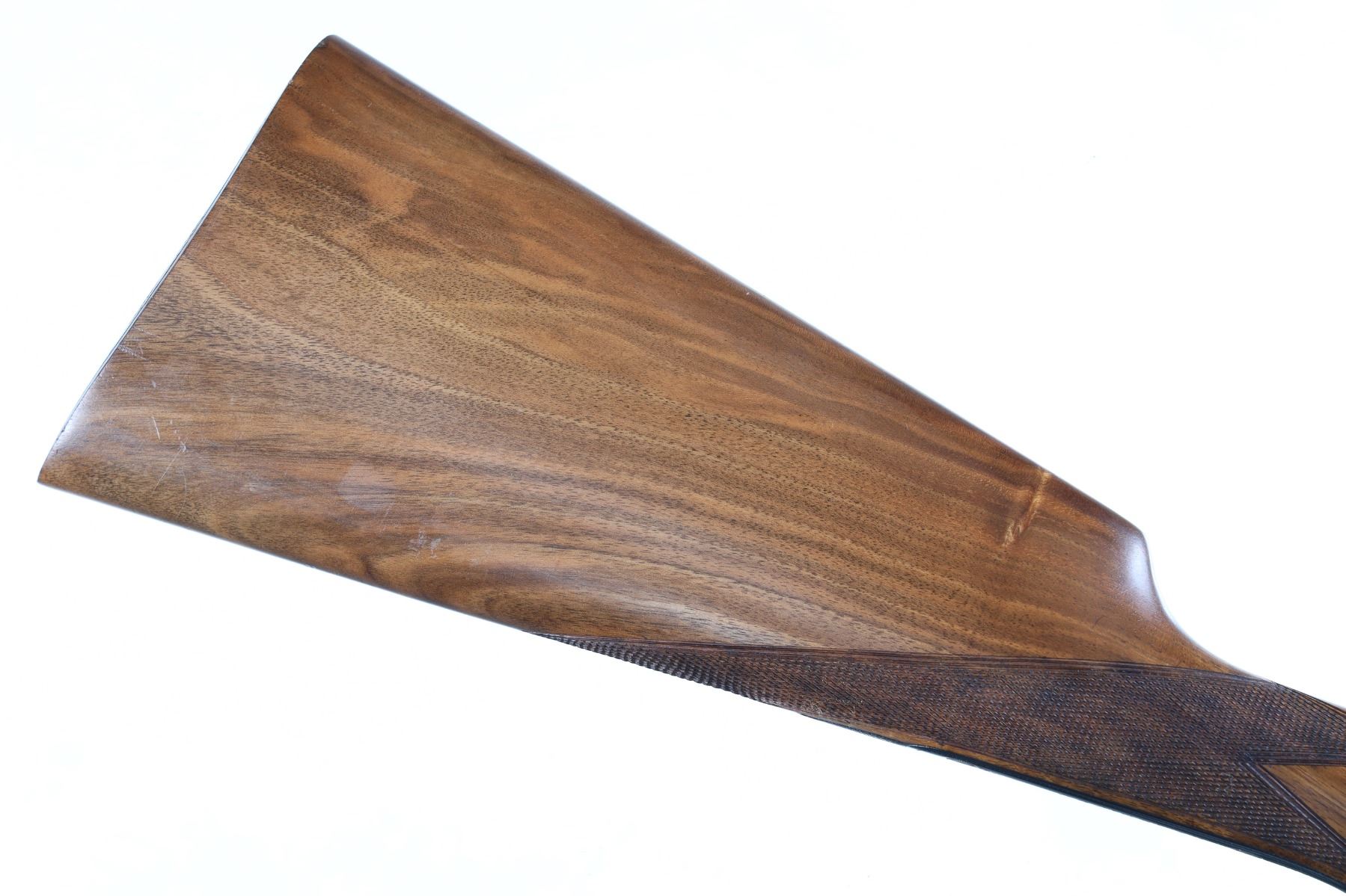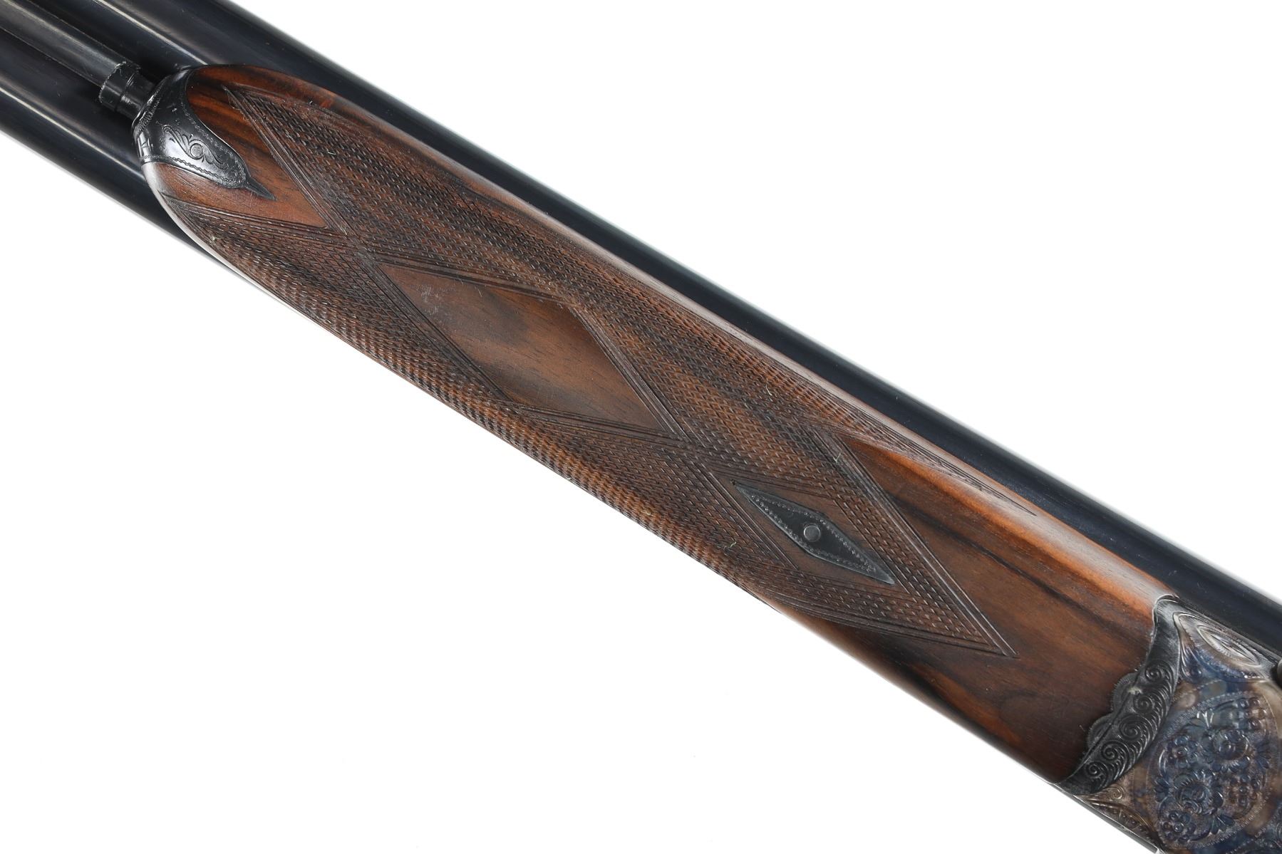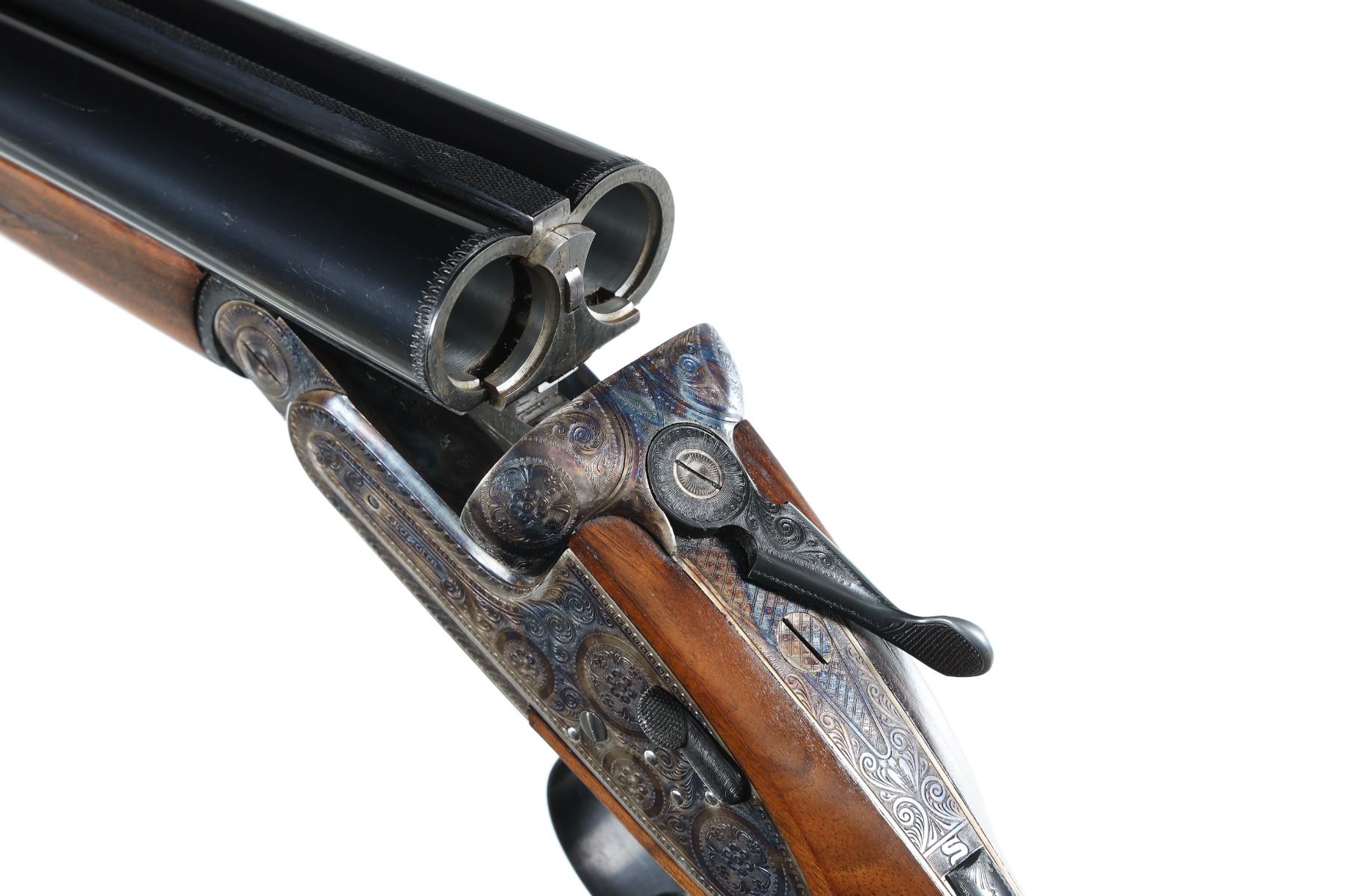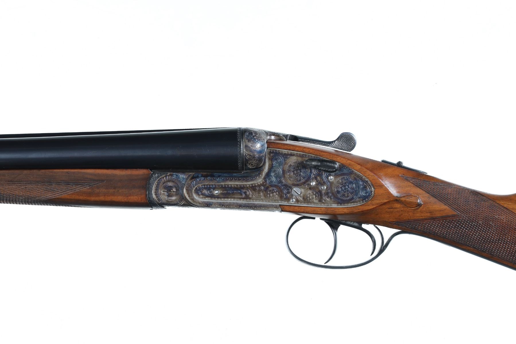 12ga Serial # 148326 Choked Full/Mod, 2 3/4" chambers. Blue finished barrels with machine engine turned faces, 5 pin quick detachable sidelock, locks and receiver are extensively engraved in rows and scroll with cocking indicators and vividly case colored. Trigger bow is deep black finished while stocks are English straight, checkered at wrist, LOP 14 1/2", DAC 1 1/2", DAH 2 1/2". Mfg in 1999. Outstanding quality Spanish double. Excellent overall condition showing little use with some handling, bores are bright, stocks are excellent. Mechanically excellent. Barrel 26" Modern