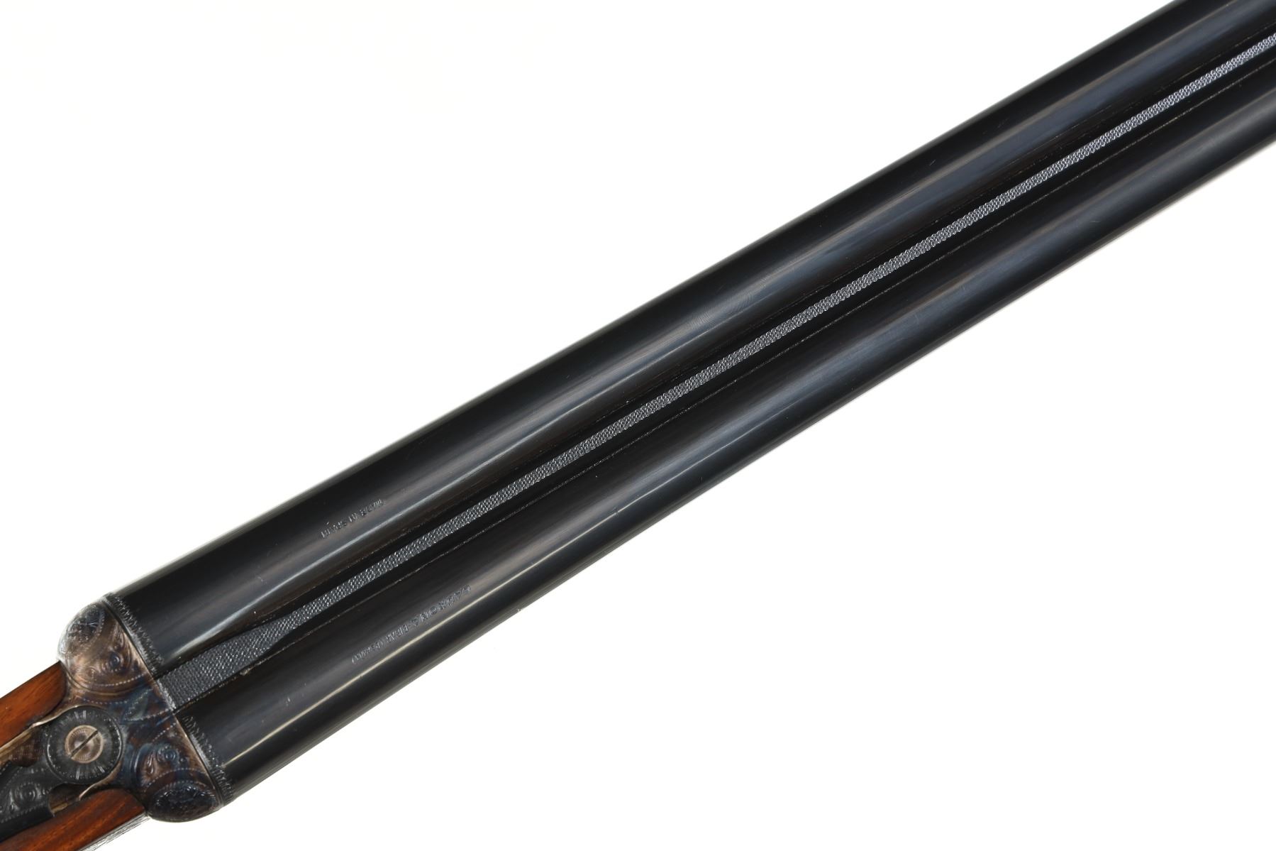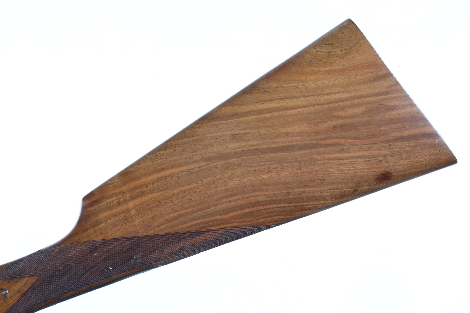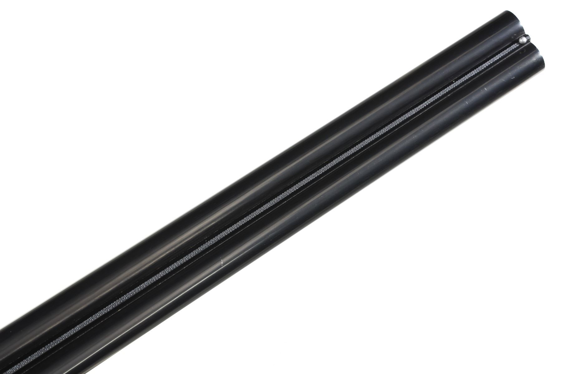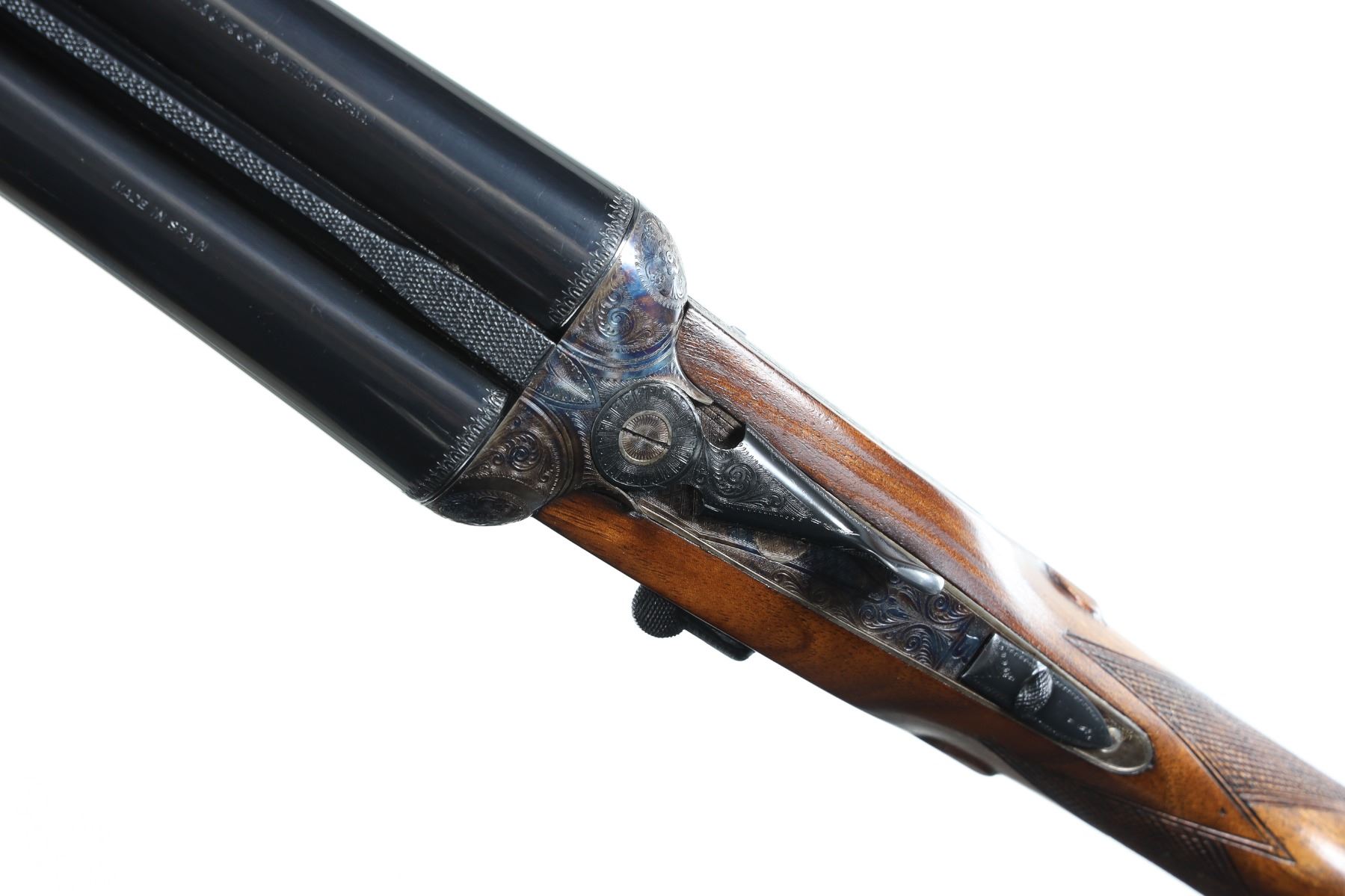 12ga Serial # 148326 Choked Full/Mod, 2 3/4" chambers. Blue finished barrels with machine engine turned faces, 5 pin quick detachable sidelock, locks and receiver are extensively engraved in rows and scroll with cocking indicators and vividly case colored. Trigger bow is deep black finished while stocks are English straight, checkered at wrist, LOP 14 1/2", DAC 1 1/2", DAH 2 1/2". Mfg in 1999. Outstanding quality Spanish double. Excellent overall condition showing little use with some handling, bores are bright, stocks are excellent. Mechanically excellent. Barrel 26" Modern