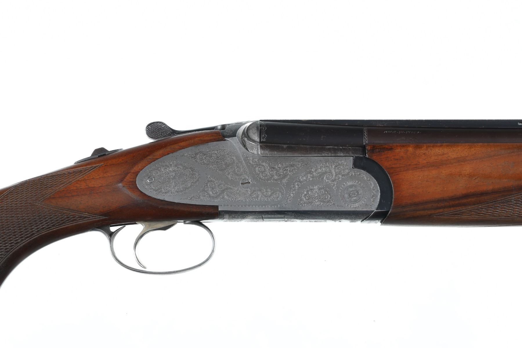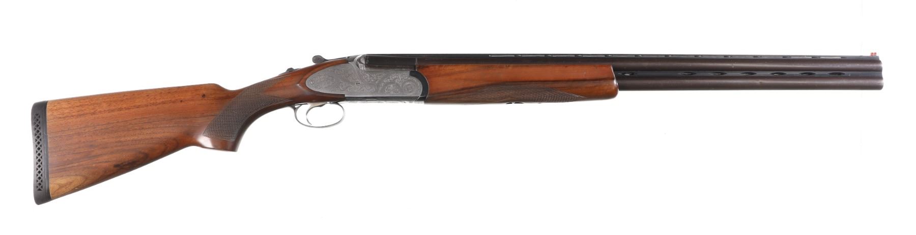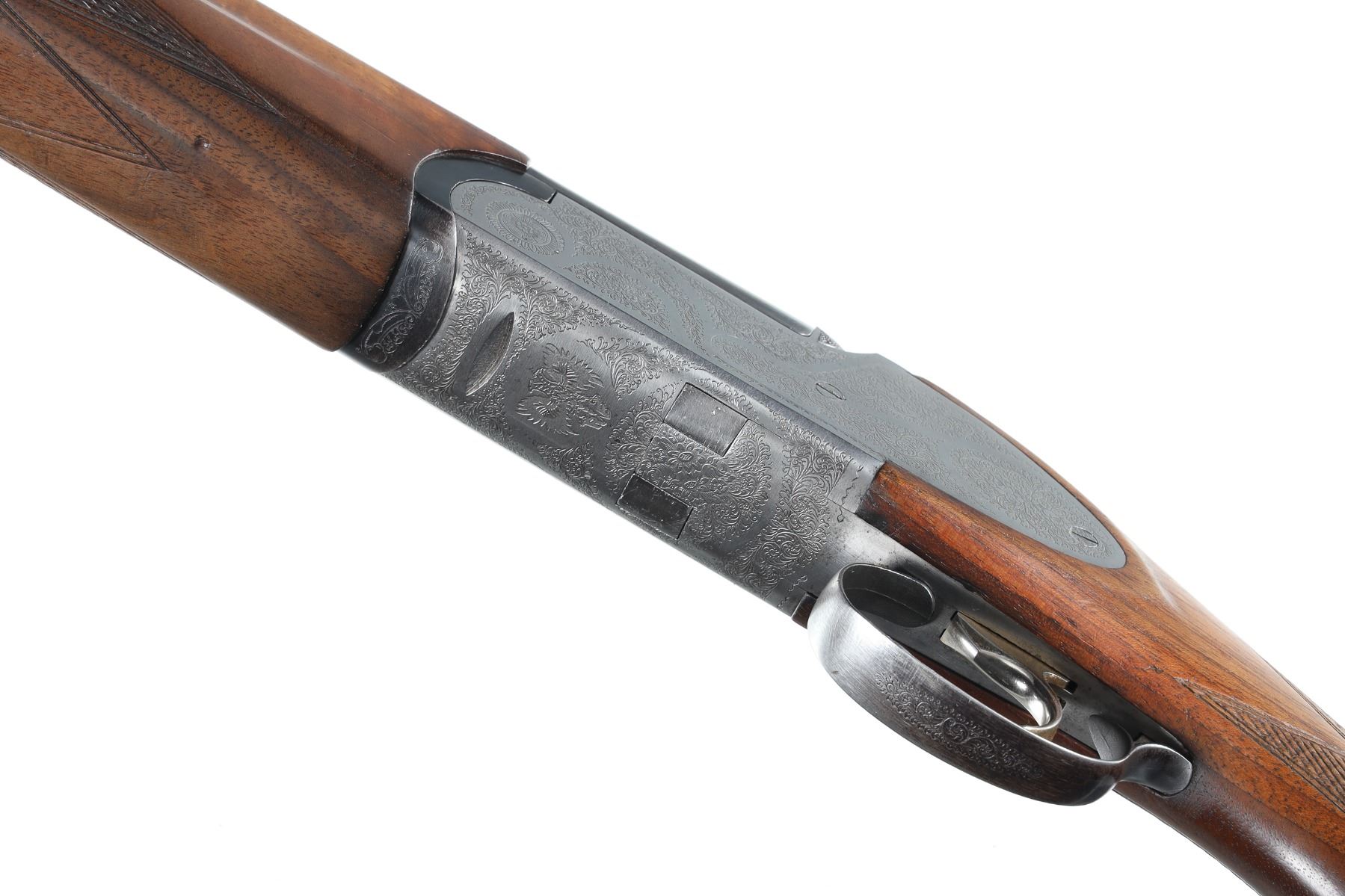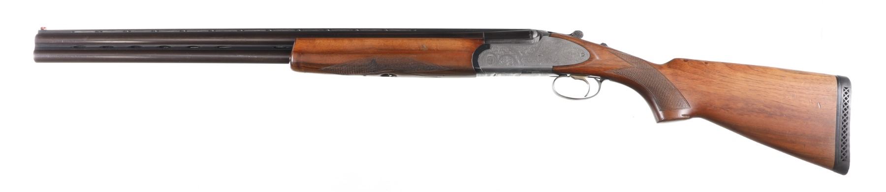 12ga Serial # 41791 Choked Imp Cyl/Mod, 2 3/4" chambers. Single selective trigger with ejectors. Sideplated boxlock with engraved receiver. Checkered pistol grip stocks. LOP 14 1/8", Drop 1 3/4"; 2 1/2". Very fine overall condition with some finish losses at chamber, stocks have bruises and impressions, mechanically excellent. Mfg in 1986 Barrel 27" Modern