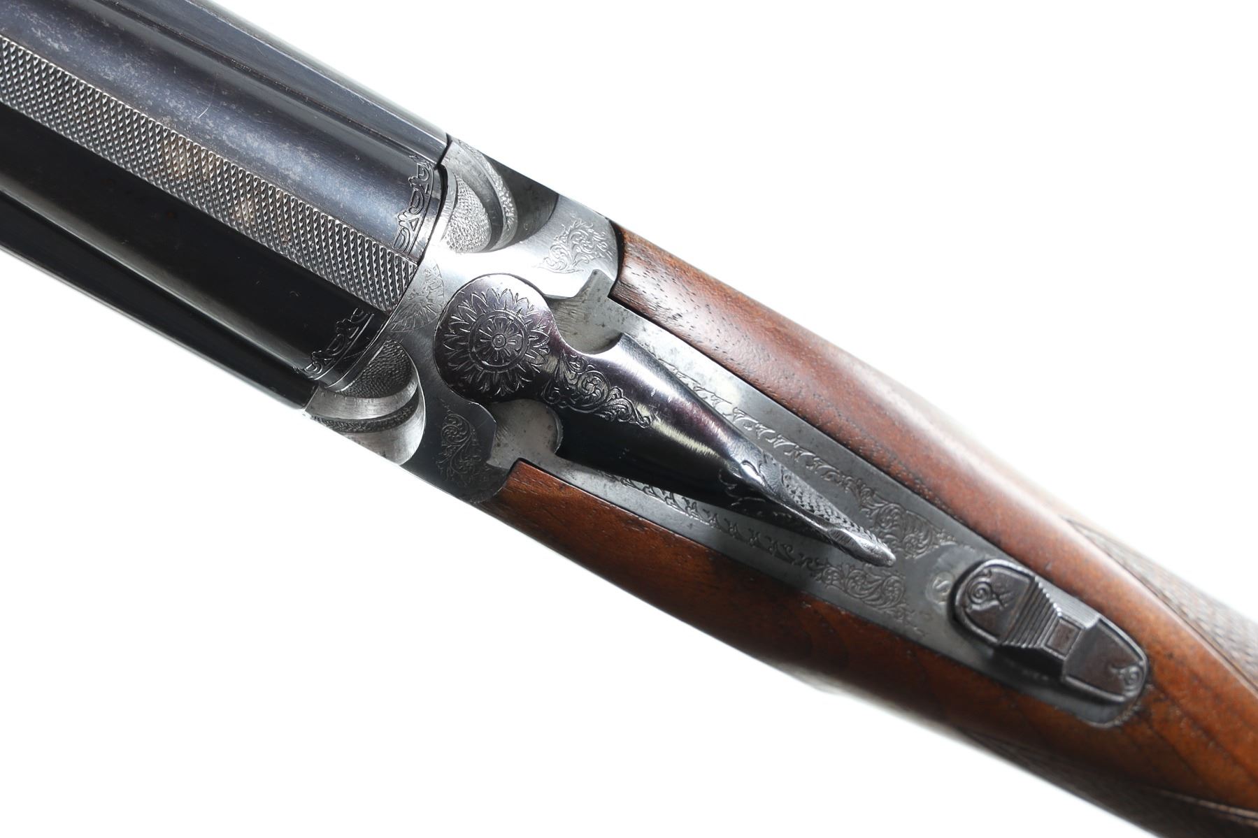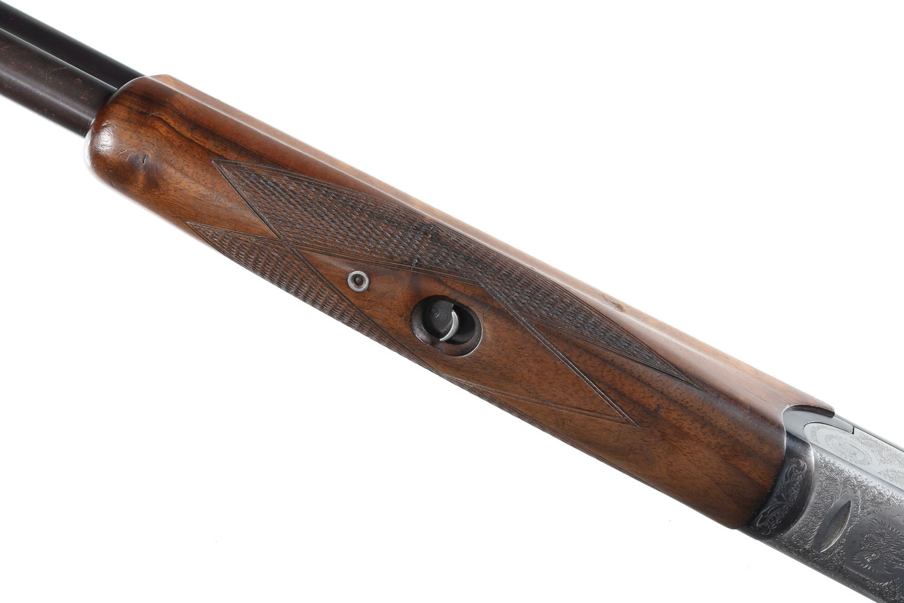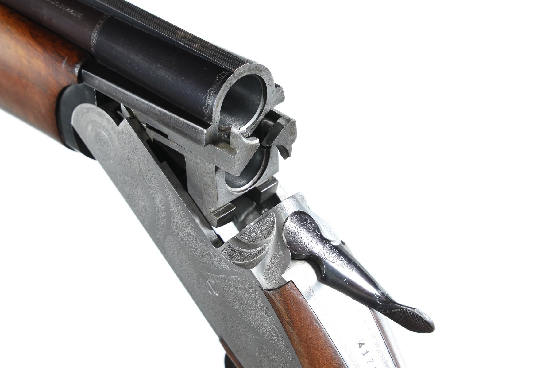 12ga Serial # 41791 Choked Imp Cyl/Mod, 2 3/4" chambers. Single selective trigger with ejectors. Sideplated boxlock with engraved receiver. Checkered pistol grip stocks. LOP 14 1/8", Drop 1 3/4"; 2 1/2". Very fine overall condition with some finish losses at chamber, stocks have bruises and impressions, mechanically excellent. Mfg in 1986 Barrel 27" Modern