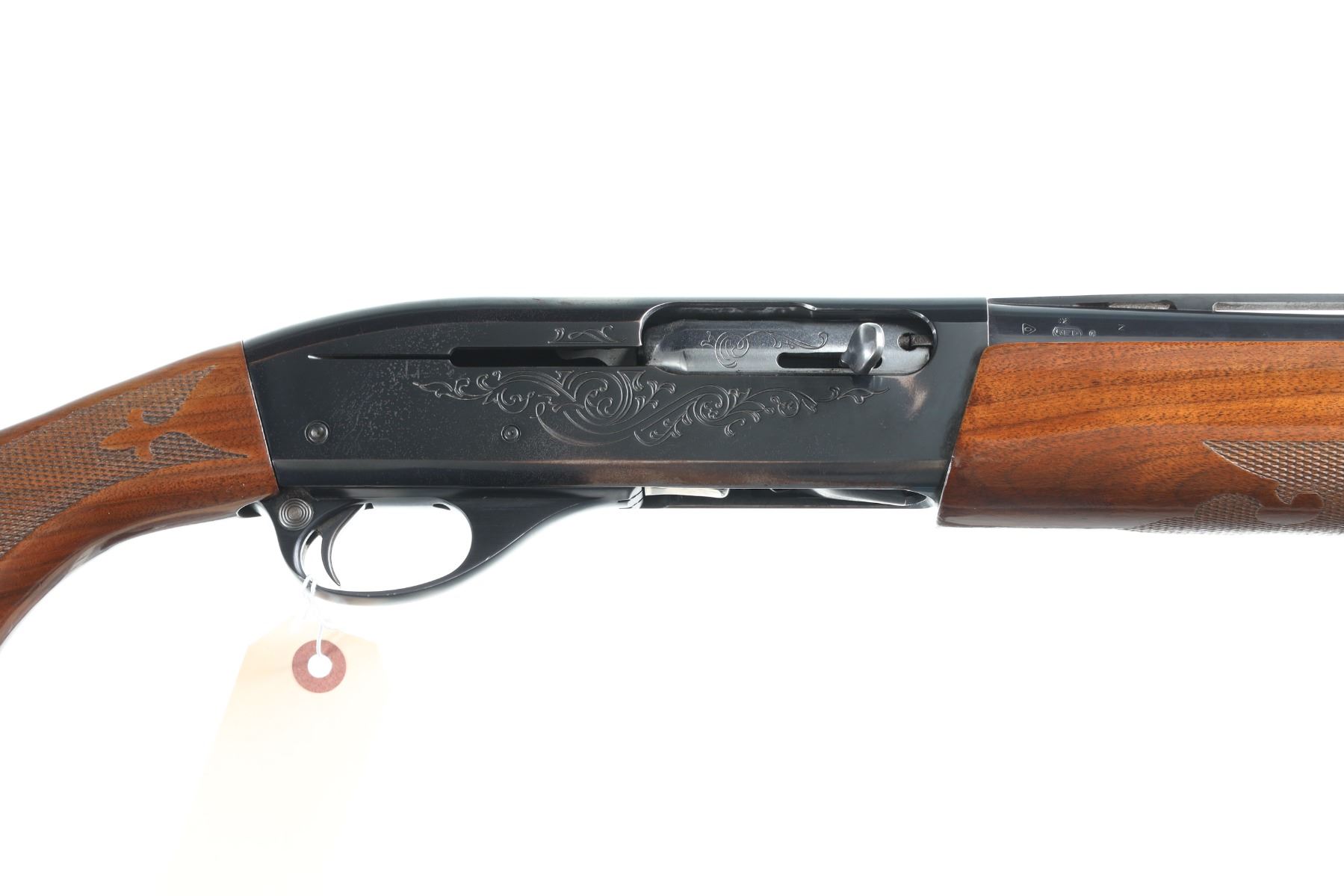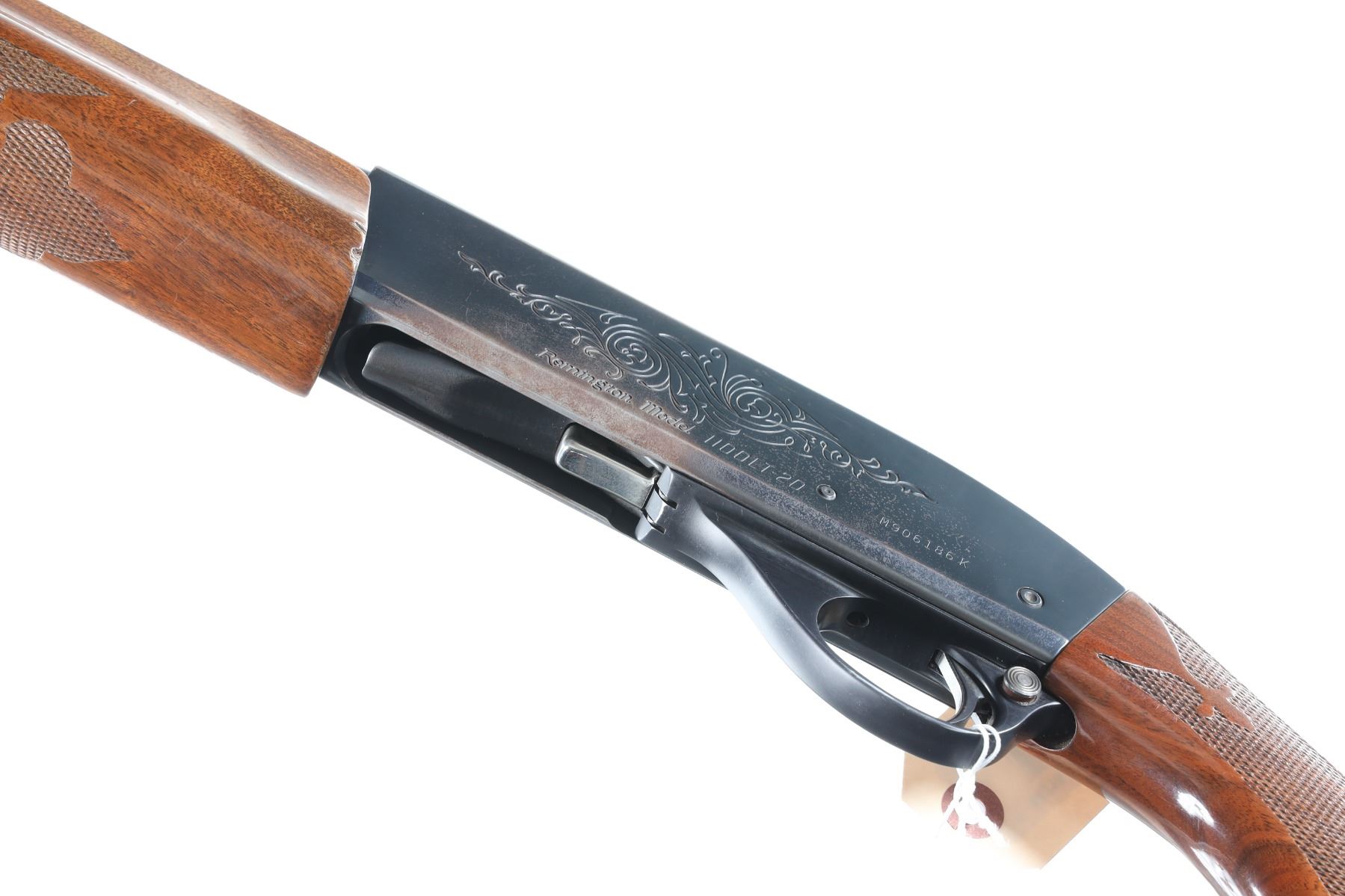 20ga Serial # M906186K Remington 1100 small bore 20 ga, skeet choked vent ribbed shotgun. Varnished checkered pistol grips stocks. Metal surfaces rate very good, blue loss to receiver from carry, crudely installed recoil pad. Mechanically fine. Chamber marked 2 3/4", choke marked skeet, 13 7/8" LOP. Barrel 25 1/2" Modern